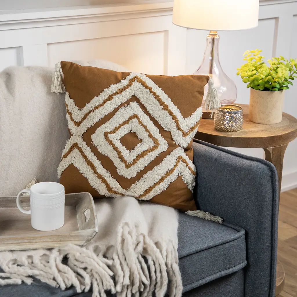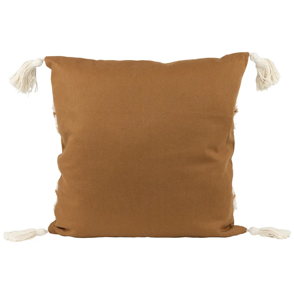 This captivating accent pillow effortlessly enhances any living space. Crafted with meticulous attention to detail, this exquisite pillow features a stunning diamond pattern outlined with delicate white fringes. The camel and cream hues blend harmoniously, creating an inviting and sophisticated atmosphere. Indulge in the supreme comfort of the tufted fabric, providing a soft and cozy touch to your seating area or bed. Features: Color(s): camel and cream Tufted square pillow The geometric diamond pattern is outlined with cream fringes Tassels accents on each corner Ideal for use in your living room or bedroom Recommended for indoor use only Care instructions: spot clean Dimensions: 16” high x 16" wide Material(s): Shell: cotton Filling: polyester
