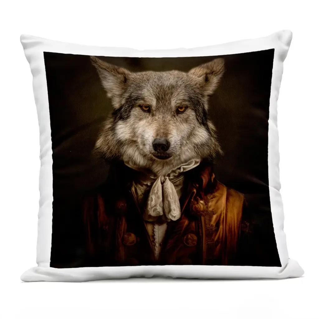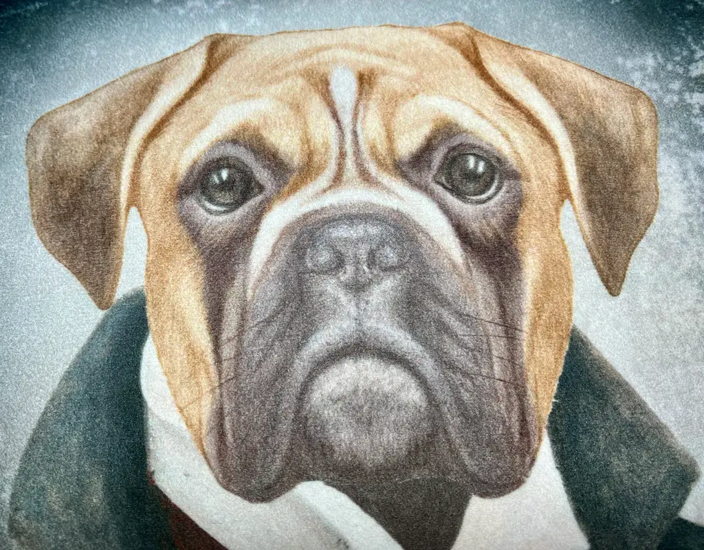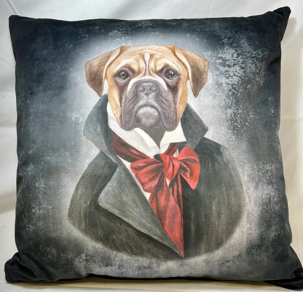 16” Square Decorative Throw Pillow Decorated With a Whimsical Portrait of a Boxer Dog Looking Like an Aristocrat - Made in the U K Measures 16" X 6" X 16" This pillow was made in Wales, U.K., by a small cottage designer/manufacturer owned by a lovely couple. The covers have a hand painted look. Excellent choice as a thoughtful housewarming gift or that perfect accent pillow for your vacation home. The covers are made of a super soft velvet- like fabric. Each cover measures 16" x 16" and the feather insert is larger in size resulting in the full look of the pillow. Dry clean only. Pillows are sold only with insert. For other designs and sizes, please check our shop here.
