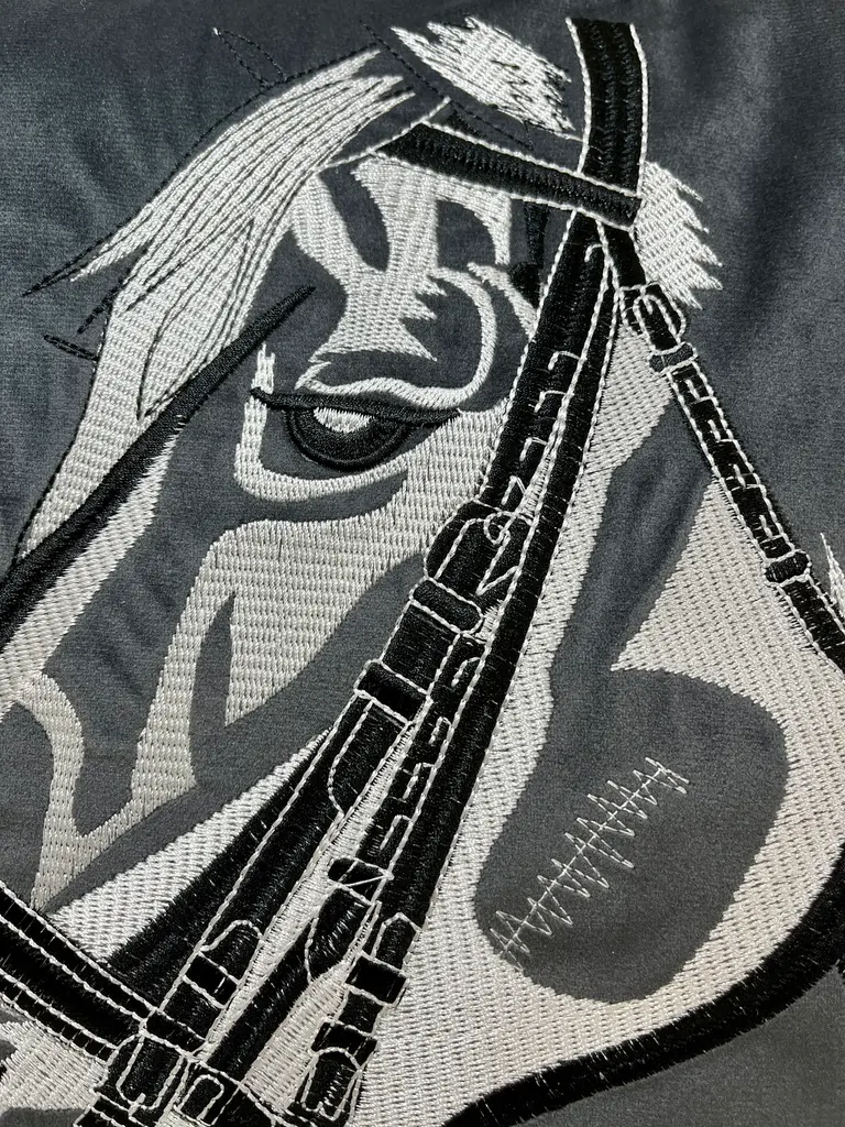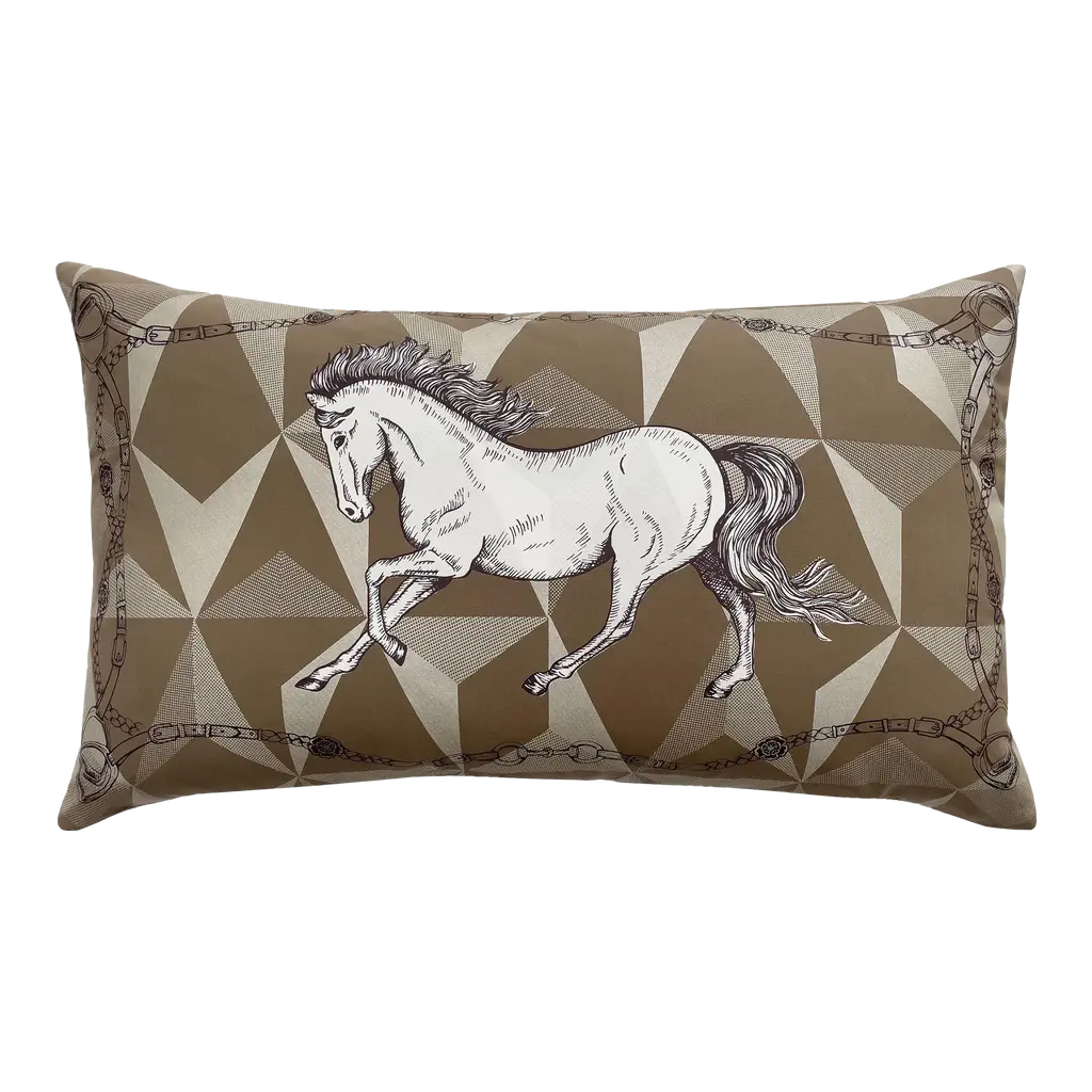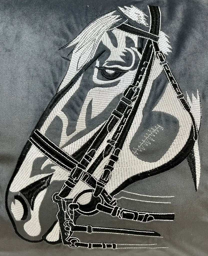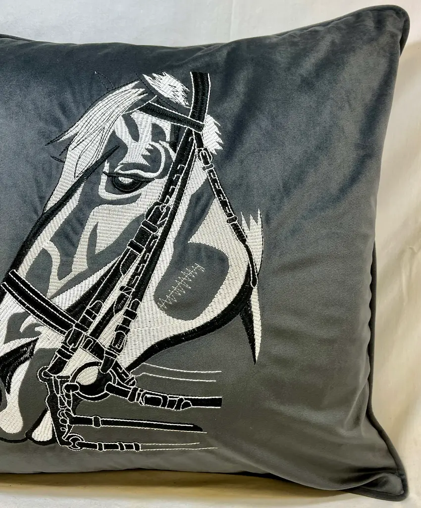 16" Square Decorative Throw Pillow Embellished With A Majestic Horse & Bridle Stitched In Silver On A Lush Graphite Background - Made In The U K