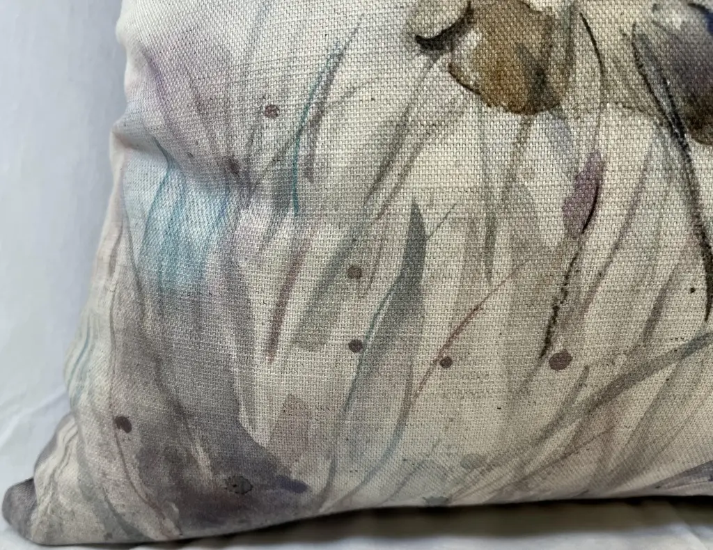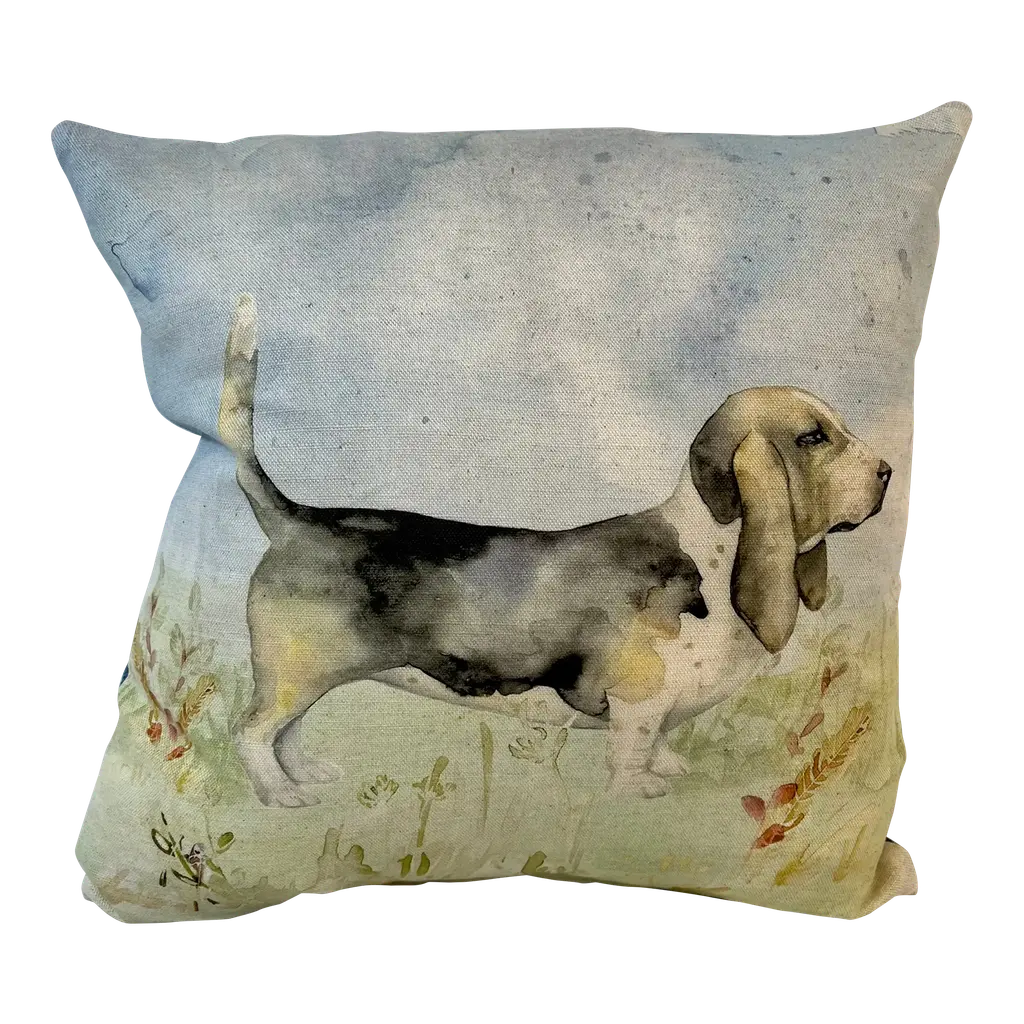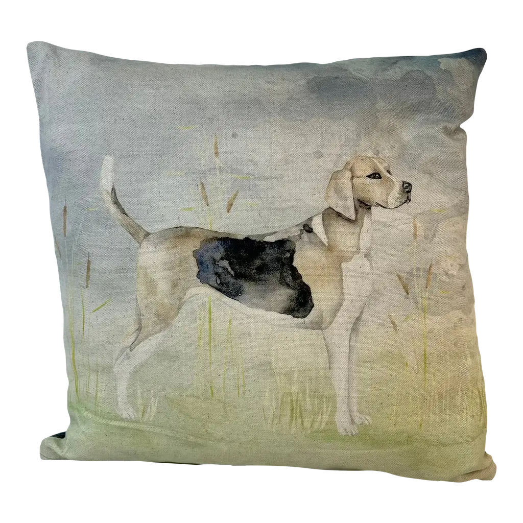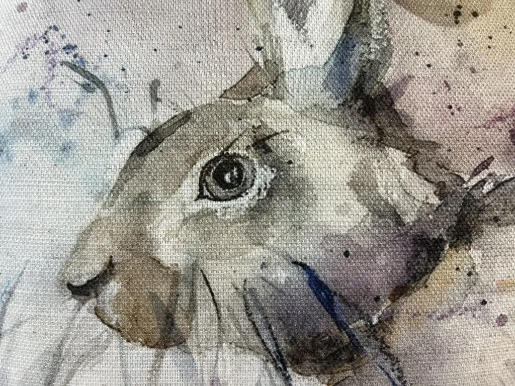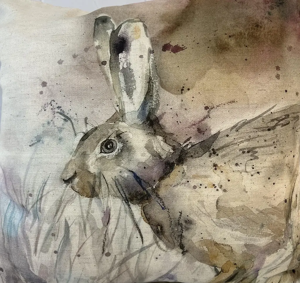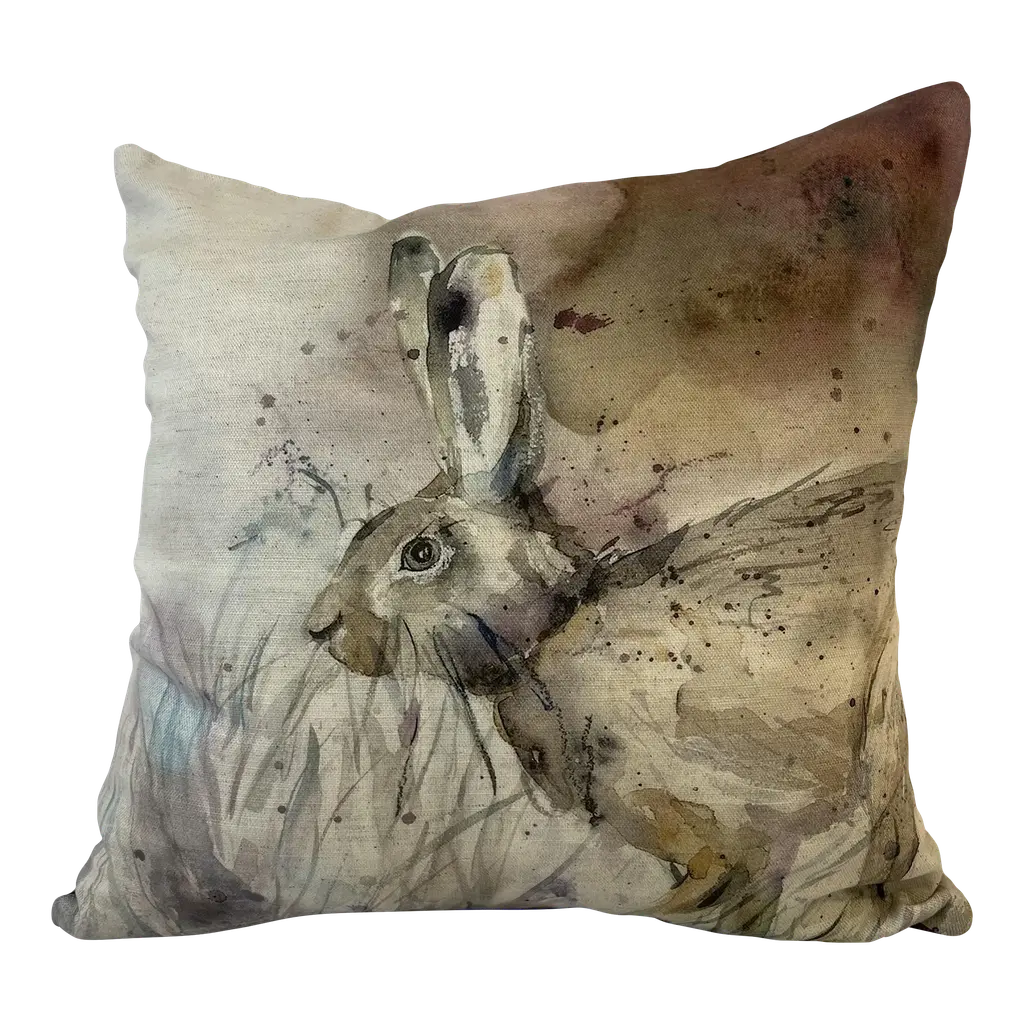 16" Square Decorative Toss Pillow Adorned With The Portrait Of An Alert Rabbit /Hare In The Grass - Made in the U K Measures 16" X 6" X 16" This pillow was made in Wales, U.K., by a small cottage designer/manufacturer owned by a lovely couple. The covers have a hand painted watercolor look. Excellent choice as a thoughtful housewarming gift or that perfect accent pillow for your vacation home. The covers are made of linen (53%) and cotton (47%). Each cover measures 16" x 16" and the feather insert is larger in size resulting in the full look of the pillow. Dry clean only. Pillows are sold only with insert. For other designs and sizes, please check our shop here.