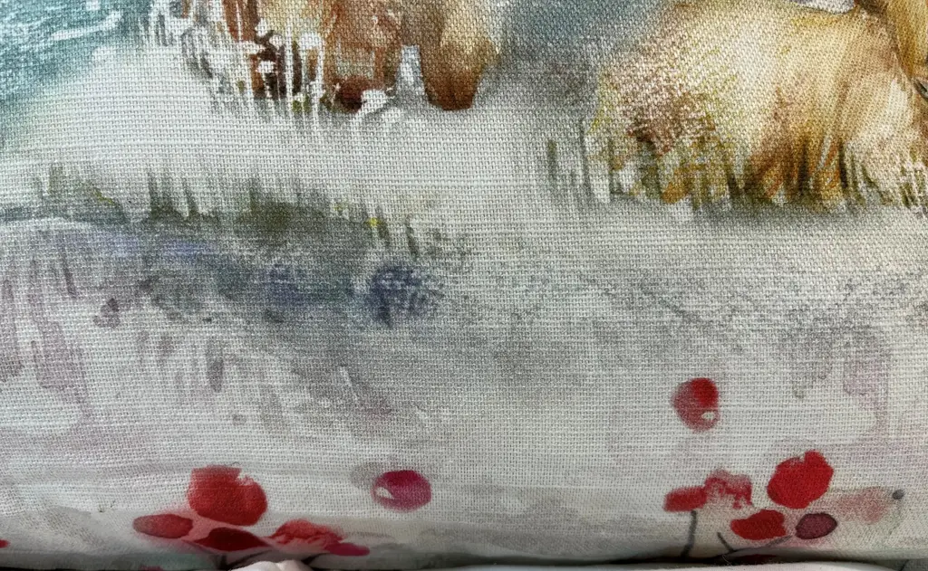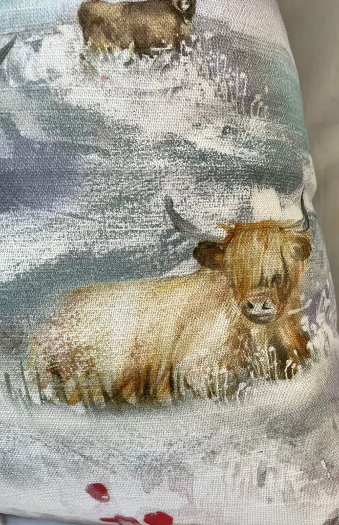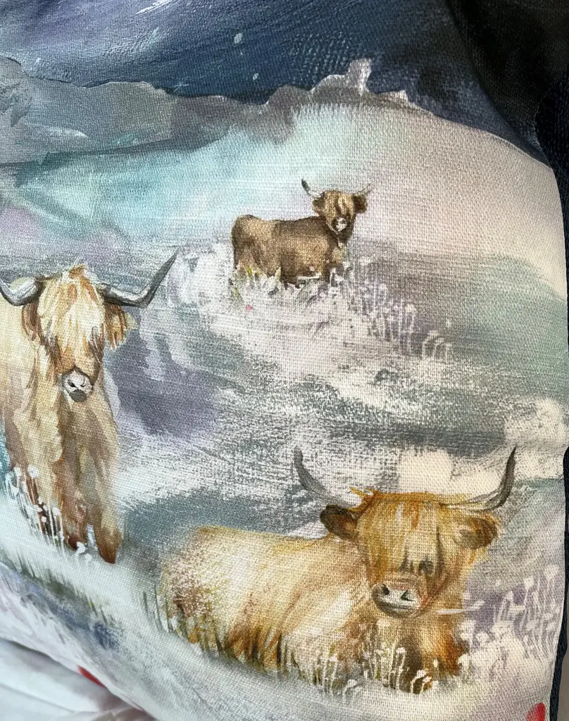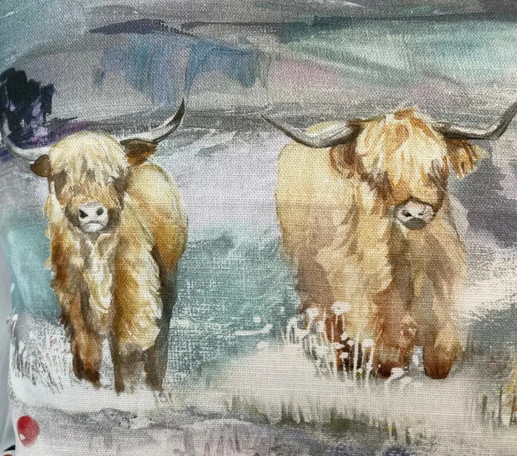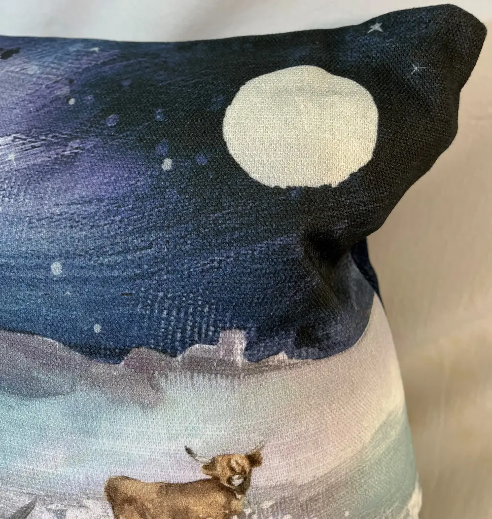 16" Square Decorative Toss Pillow Embellished With A Fold Of Highland Cows Grazing Under The Moon - Made in the U K Measures 16" X 6" X 16" This pillow was made in Wales, U.K., by a small cottage designer/manufacturer owned by a lovely couple. The covers have a hand painted watercolor look. Excellent choice as a thoughtful housewarming gift or that perfect accent pillow for your vacation home. The covers are made of linen (53%) and cotton (47%). Each cover measures 16" x 16" and the feather insert is larger in size resulting in the full look of the pillow. Dry clean only. Pillows are sold only with insert. For other designs and sizes, please check our shop here.