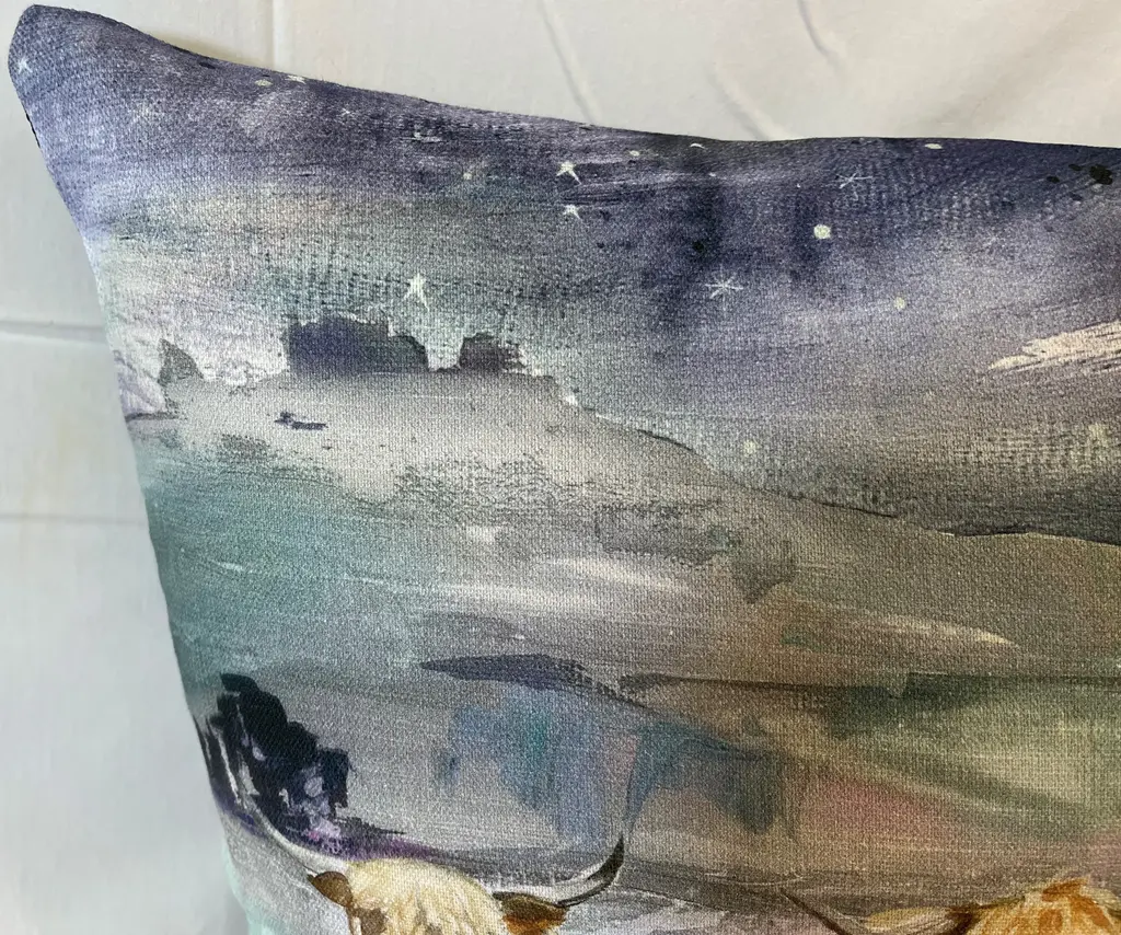 16" Square Decorative Toss Pillow Embellished With A Fold Of Grazing Highland Cows Under The Moon - Made In The U K