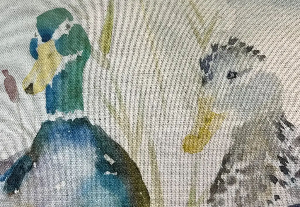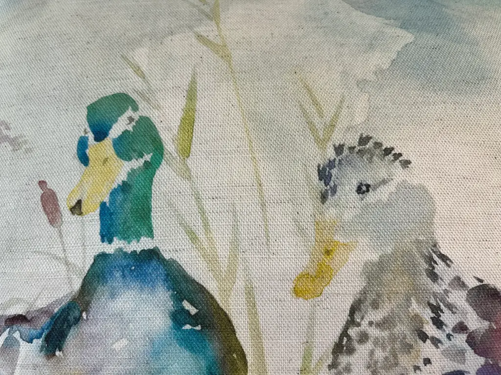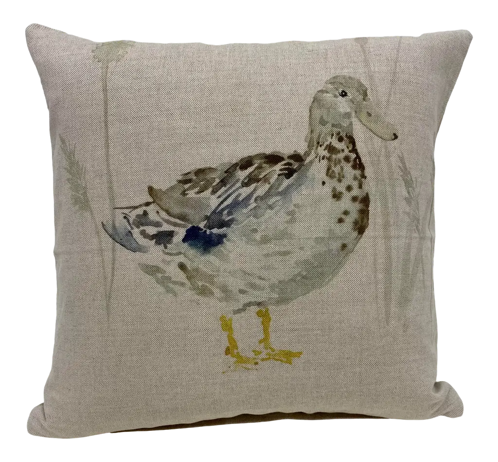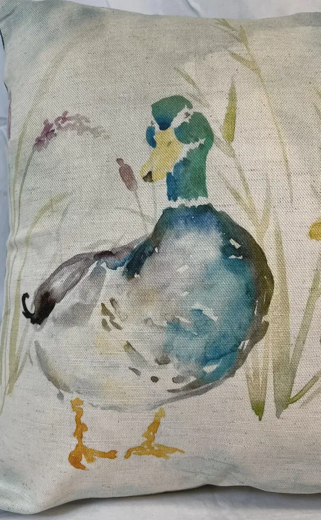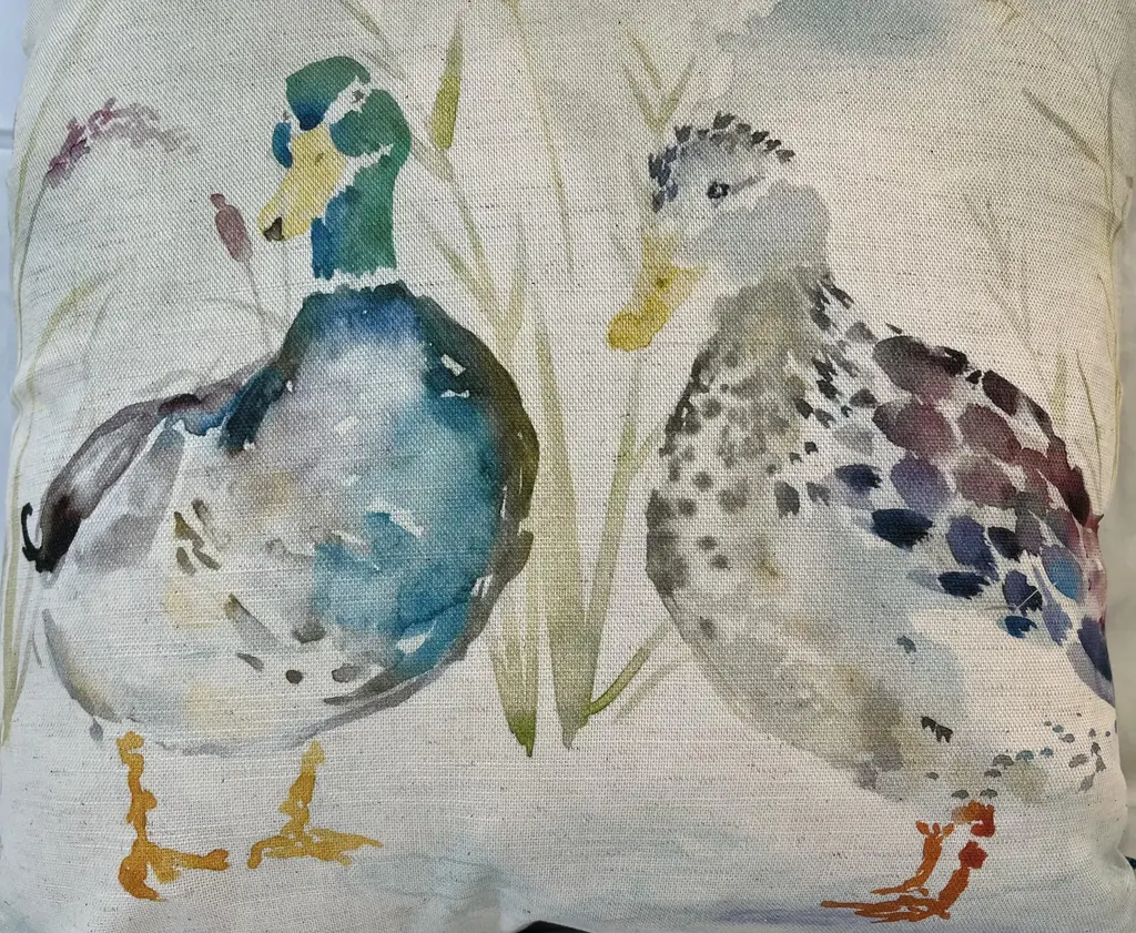 16" Square Decorative Toss Pillow Adorned With A Pair Of Majestic Ducks - Made in the U K Measures 16" X 6" X 16" This pillow was made in Wales, U.K., by a small cottage designer/manufacturer owned by a lovely couple. The covers have a hand painted watercolor look. Excellent choice as a thoughtful housewarming gift or that perfect accent pillow for your vacation home. The covers are made of linen (53%) and cotton (47%). Each cover measures 16" x 16" and the feather insert is larger in size resulting in the full look of the pillow. Dry clean only. Pillows are sold only with insert. For other designs and sizes, please check our shop here.