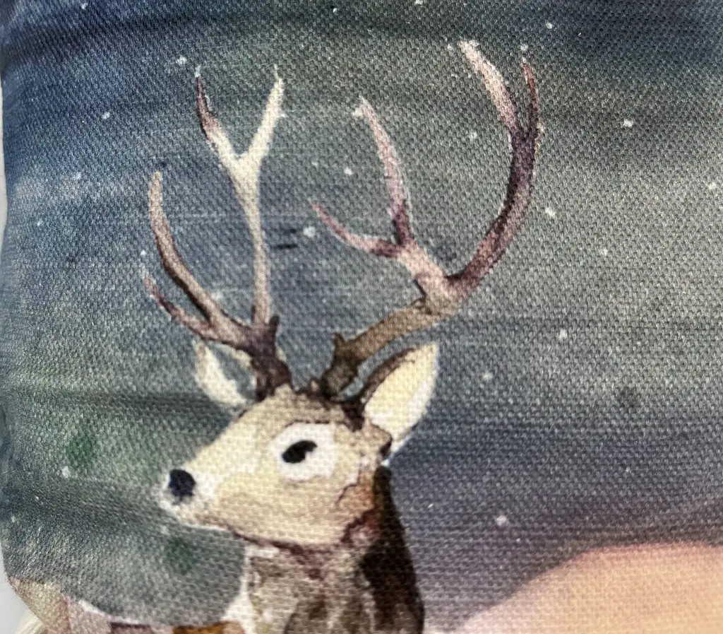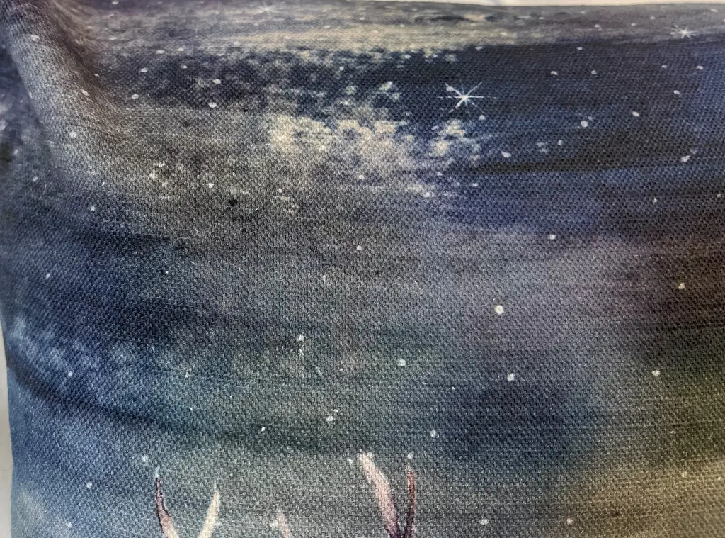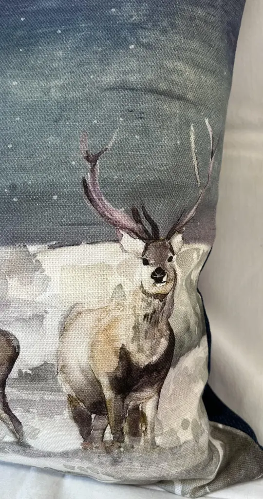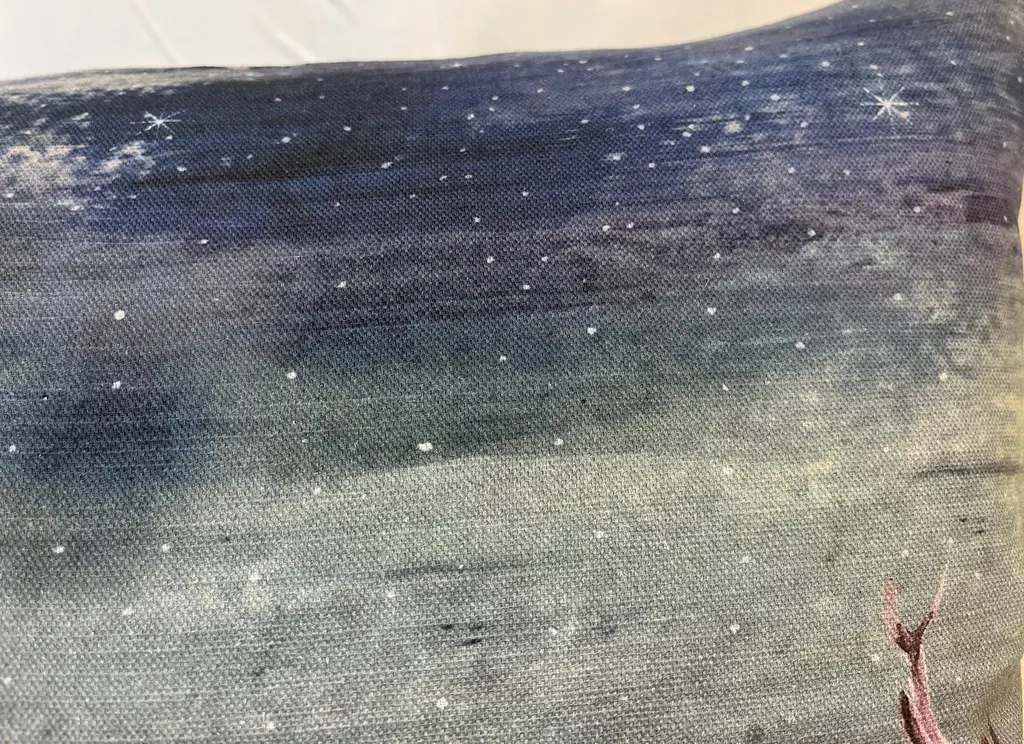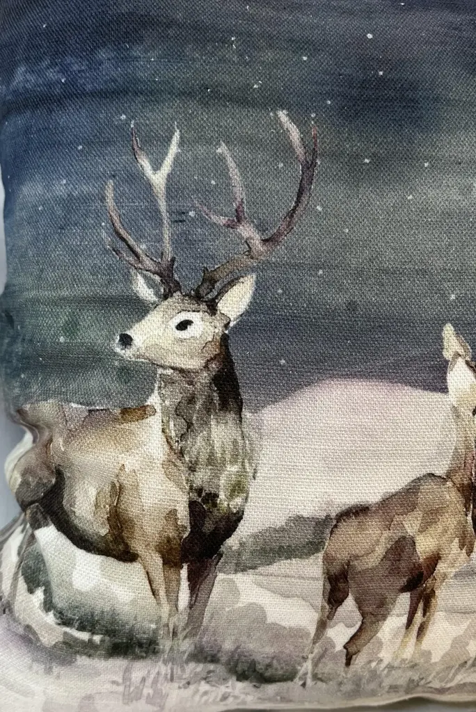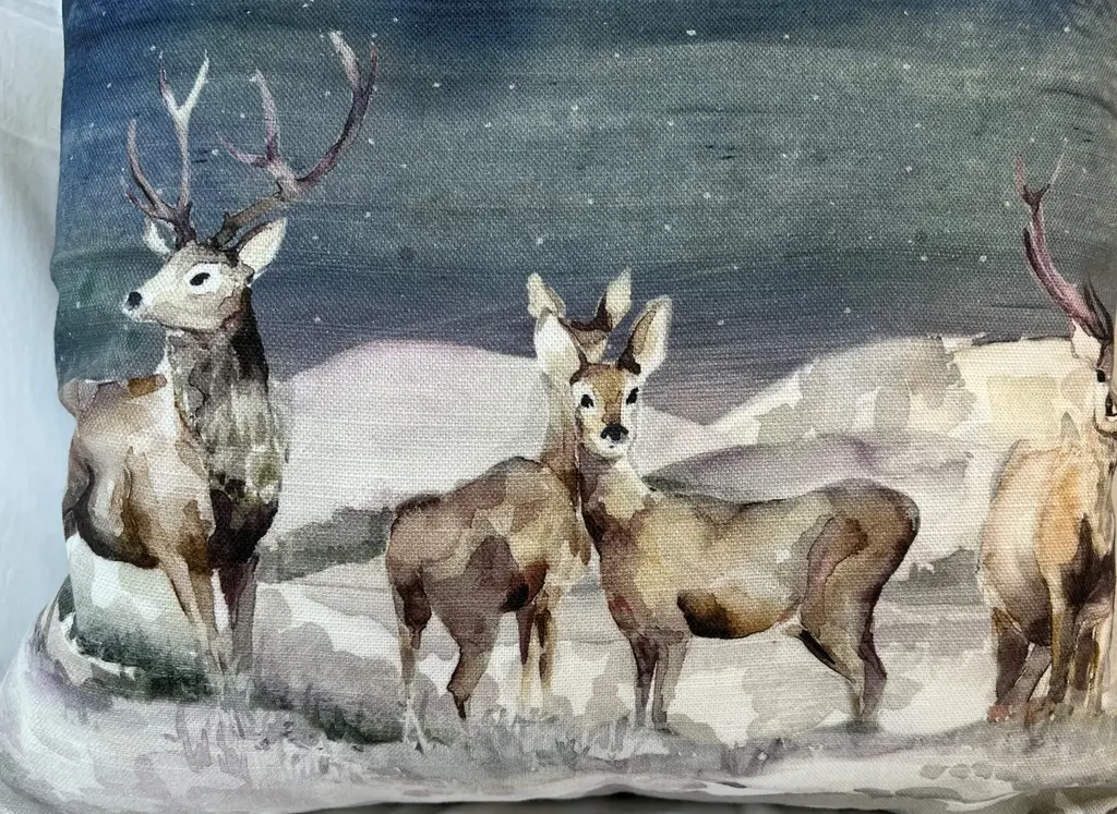 16" Square Decorative Toss Pillow Adorned With A Rangale Of Grazing Deer Under The Stars - Made in the U K Measures 16" X 6" X 16" This pillow was made in Wales, U.K., by a small cottage designer/manufacturer owned by a lovely couple. The covers have a hand painted watercolor look. Excellent choice as a thoughtful housewarming gift or that perfect accent pillow for your vacation home. The covers are made of linen (53%) and cotton (47%). Each cover measures 16" x 16" and the feather insert is larger in size resulting in the full look of the pillow. Dry clean only. Pillows are sold only with insert. For other designs and sizes, please check our shop here.