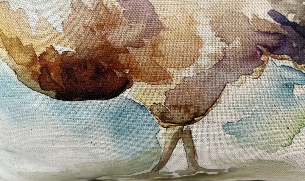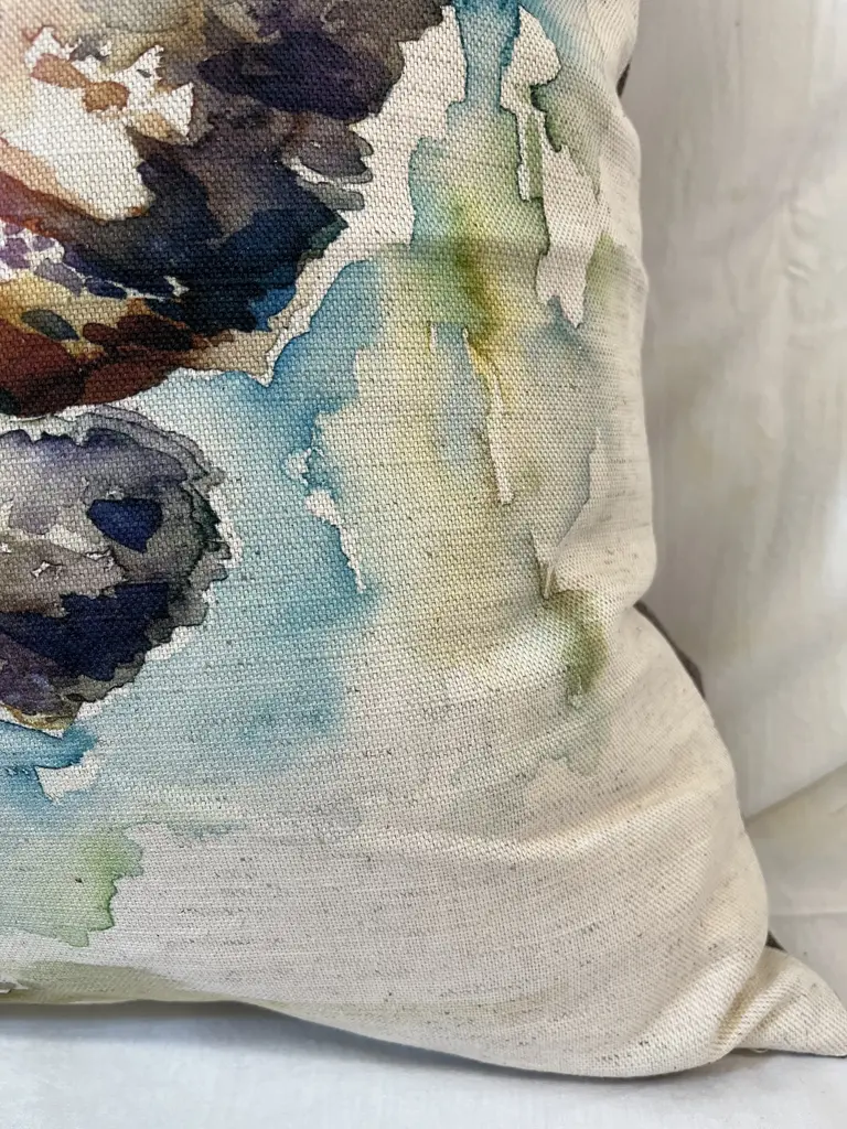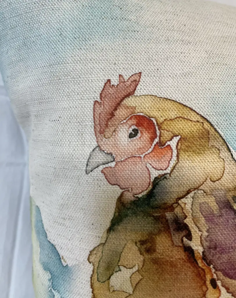 16" Square Decorative Toss Pillow Adorned With The Portrait Of An Impressive Hen / Chicken - Made in the U K Measures 16" X 6" X 16" This pillow was made in Wales, U.K., by a small cottage designer/manufacturer owned by a lovely couple. The covers have a hand painted watercolor look. Excellent choice as a thoughtful housewarming gift or that perfect accent pillow for your vacation home. The covers are made of linen (53%) and cotton (47%). Each cover measures 16" x 16" and the feather insert is larger in size resulting in the full look of the pillow. Dry clean only. Pillows are sold only with insert. For other designs and sizes, please check our shop here.