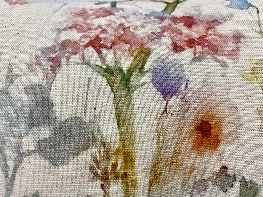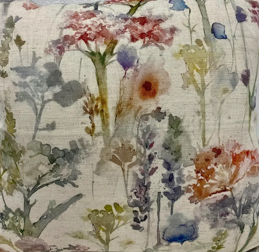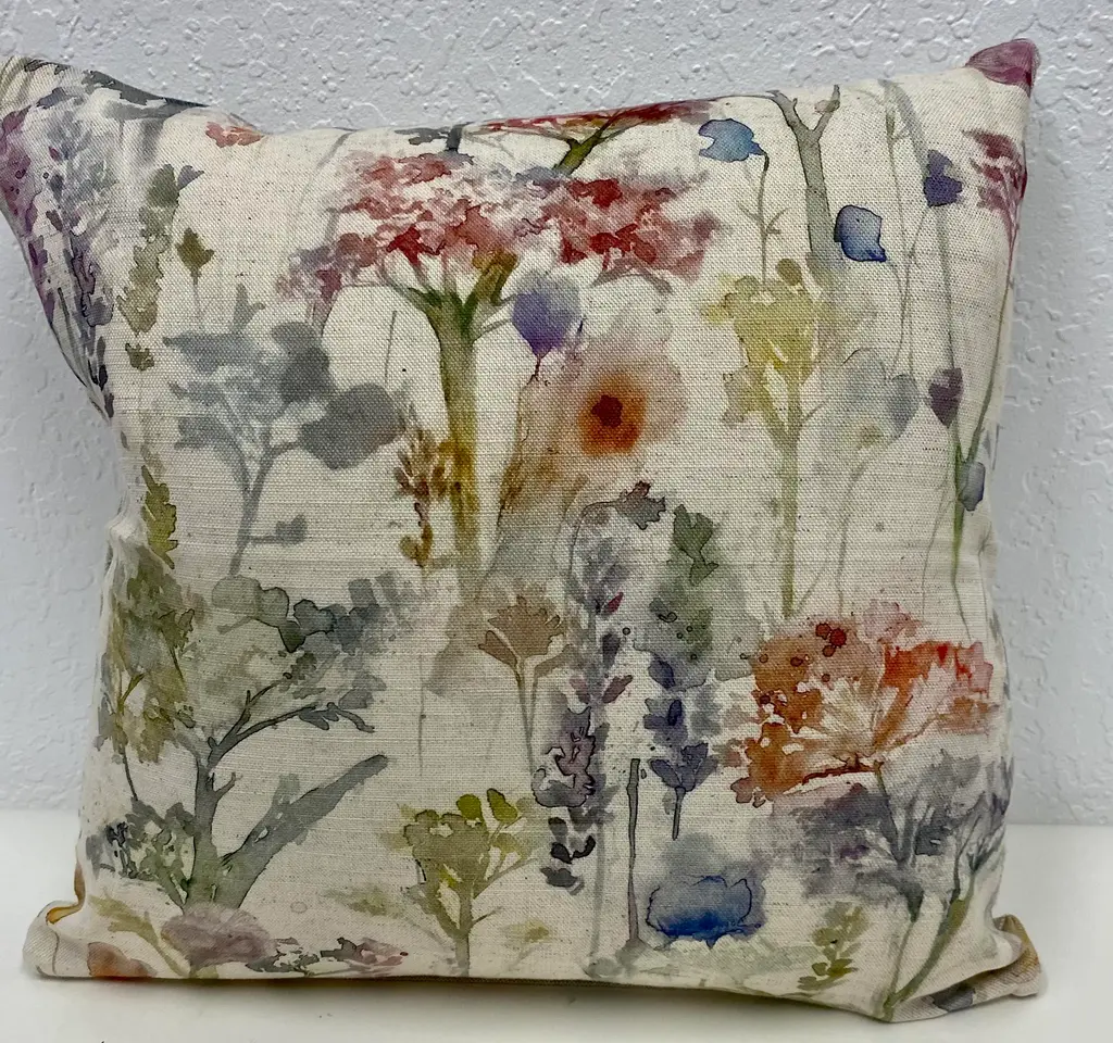 16" Square Pillow With A Watercolor-Look Pattern Depicting Pink, Coral & Purple Trees & Flowers - Made in UK. This pillow was made in Wales, U.K., by a small cottage designer/manufacturer owned by a lovely couple. The covers have a hand painted look. The covers are made of linen (53%) and cotton (47%). Each cover measures 16" x 16" and the feather insert is larger in size resulting in the full look of the pillow. Dry clean only. Pillows are sold only with insert. For other designs and sizes, please check our shop here.