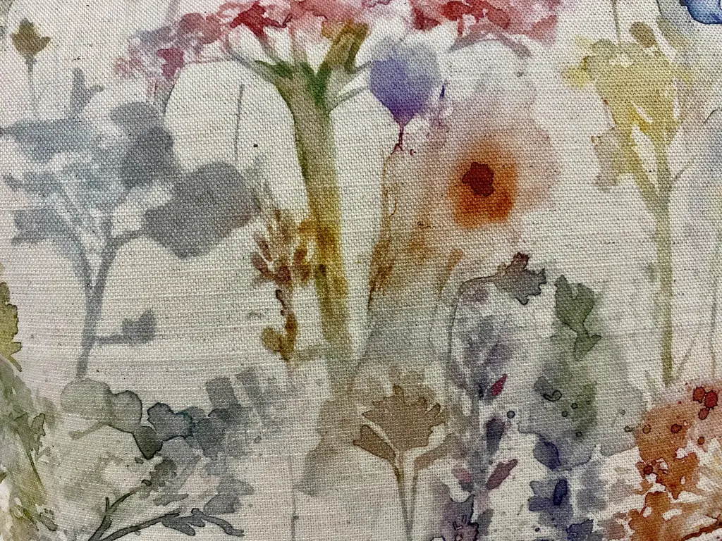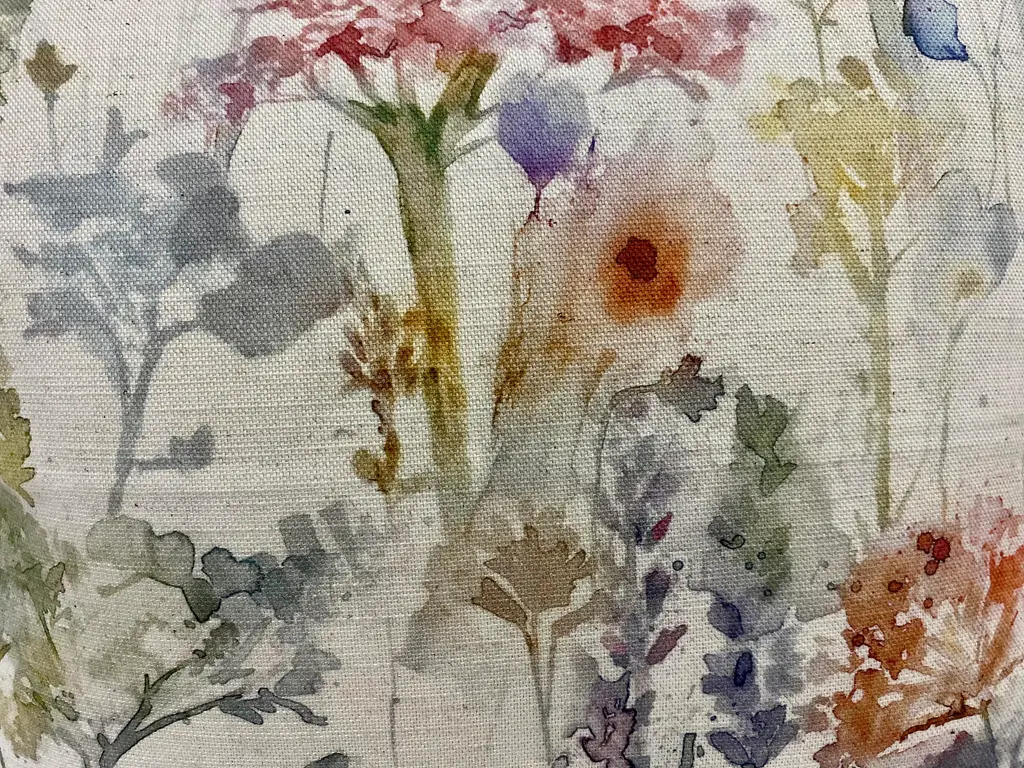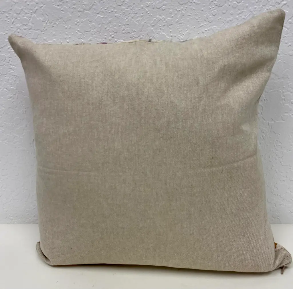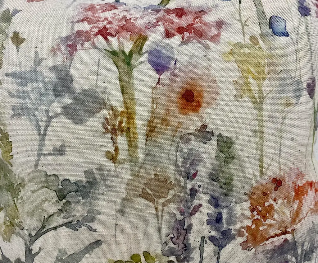 16" Square Pillow With A Watercolor-Look Pattern Depicting Pink, Coral & Purple Trees & Flowers - Made in UK. This pillow was made in Wales, U.K., by a small cottage designer/manufacturer owned by a lovely couple. The covers have a hand painted look. The covers are made of linen (53%) and cotton (47%). Each cover measures 16" x 16" and the feather insert is larger in size resulting in the full look of the pillow. Dry clean only. Pillows are sold only with insert. For other designs and sizes, please check our shop here.