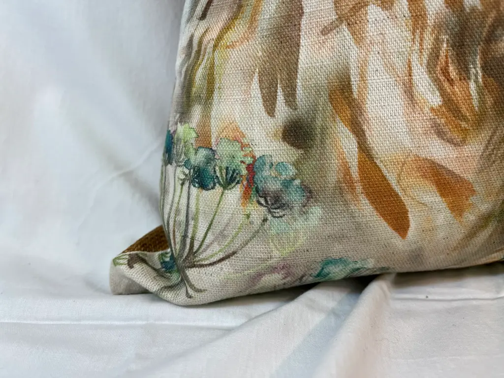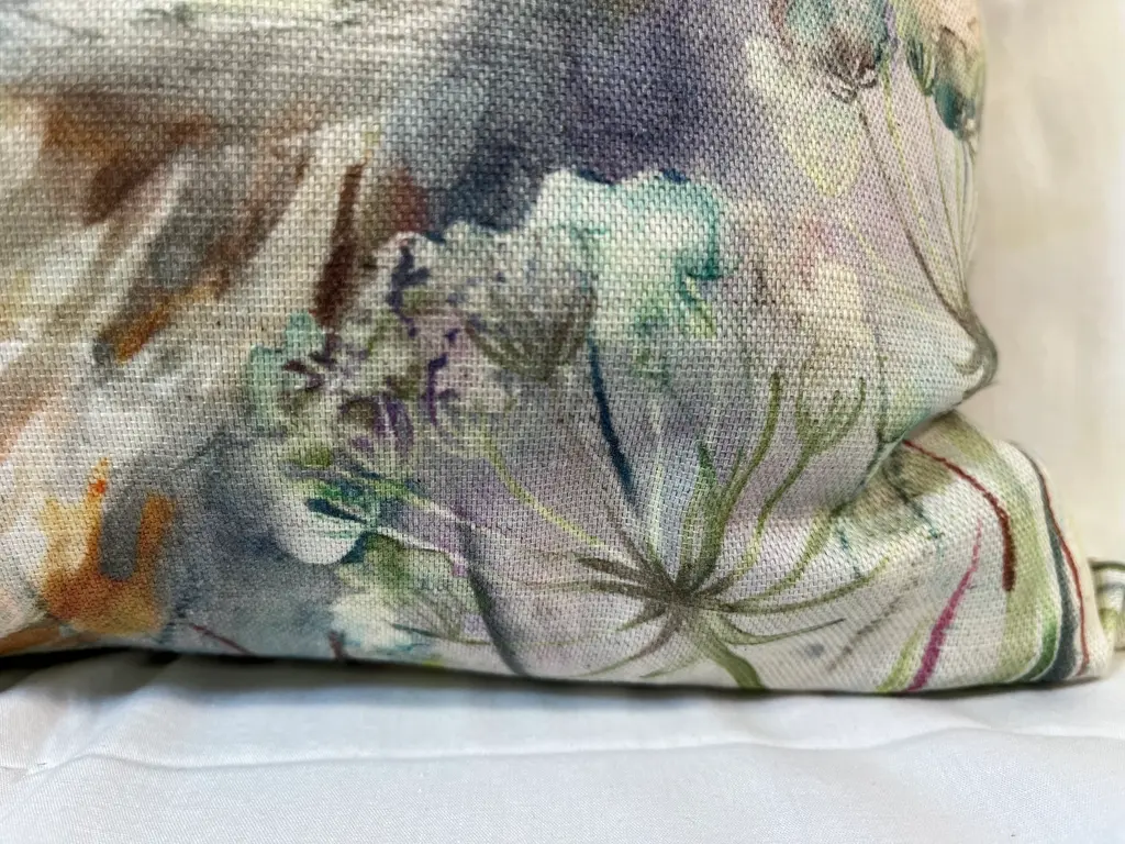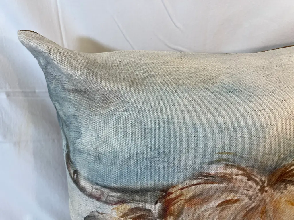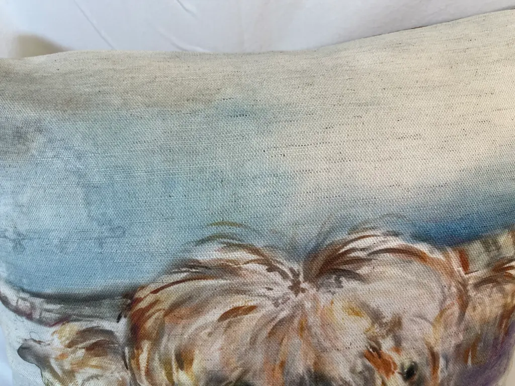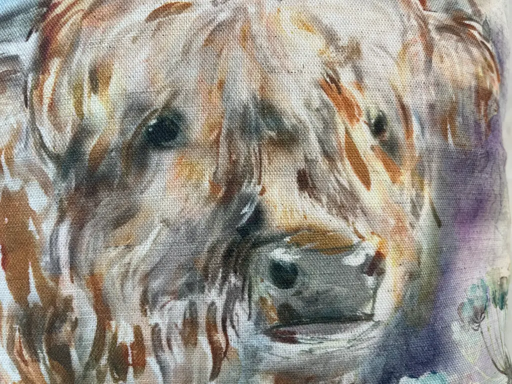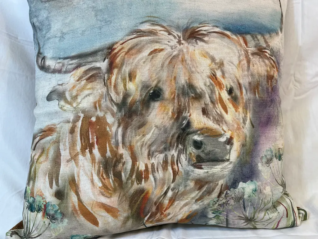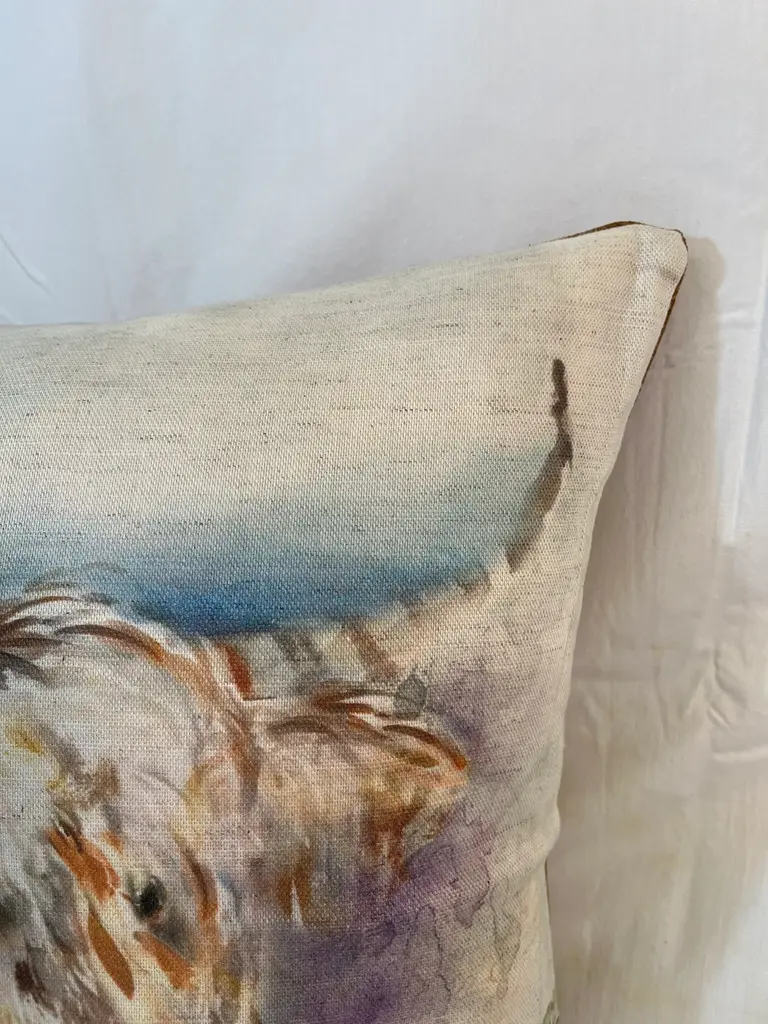 16" Square Decorative Toss Pillow Adorned With The Portrait Of A Majestic Highland - Made in the U K Measures 16" X 6" X 16" This pillow was made in Wales, U.K., by a small cottage designer/manufacturer owned by a lovely couple. The covers have a hand painted watercolor look. Excellent choice as a thoughtful housewarming gift or that perfect accent pillow for your vacation home. The covers are made of linen (53%) and cotton (47%). Each cover measures 16" x 16" and the feather insert is larger in size resulting in the full look of the pillow. Dry clean only. Pillows are sold only with insert. For other designs and sizes, please check our shop here.