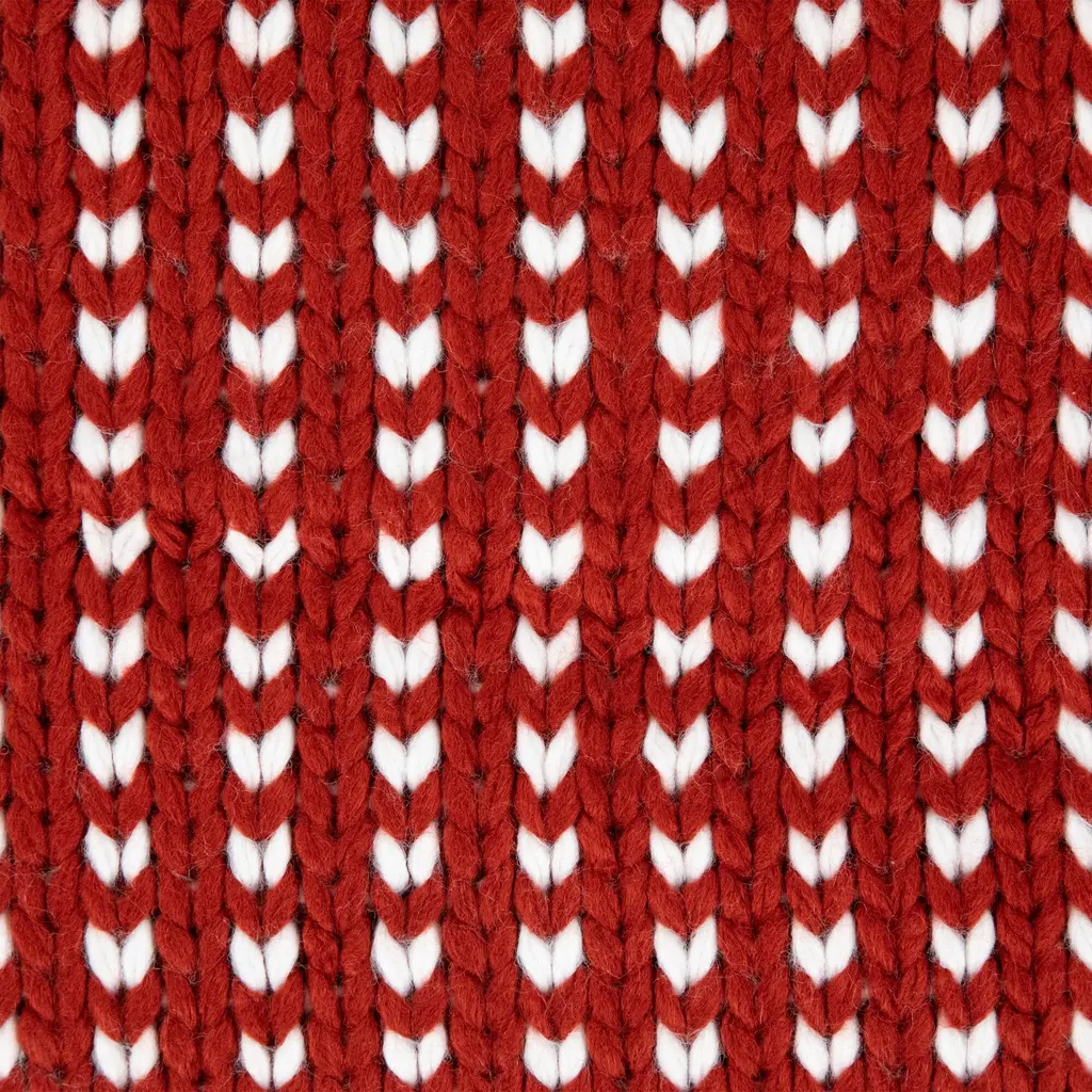 Crafted with care, this pillow features a knitted front in striking red and white hues, evoking a sense of warmth and coziness. The solid red velvet back adds a touch of elegance, making it perfect for displaying from every angle. To top it off, charming red pompoms grace each corner, bringing a playful and inviting element to any space. Whether it's adorning your living room sofa or adding a whimsical touch to your bedroom, this knitted square throw pillow is sure to be a great decorative accent in your home. Features: Color(s): red and white One-sided design Reversible- knitted red and white front with a solid red velvet back Accented with red pompoms on each corner Perfect for your living room or bedroom Recommended for indoor use only Dimensions: 18” high x 18" wide Material(s): Shell: acrylic/velvet Filling: polyester