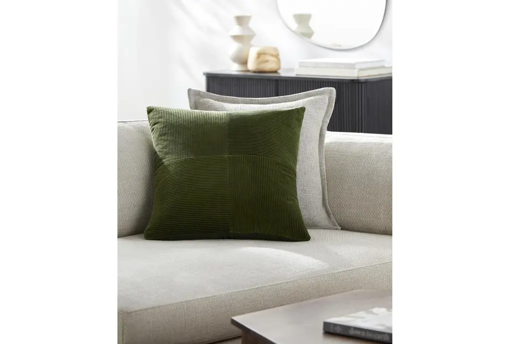 Introducing the 18" x 18" Olive Cotton Corduroy Quarters Accent Pillow by Surya, designed to bring a touch of comfort and style to your home. This square pillow features a rich olive color and is crafted from 100% cotton corduroy, offering both durability and softness. It's machine washable, making it easy to keep fresh and clean.