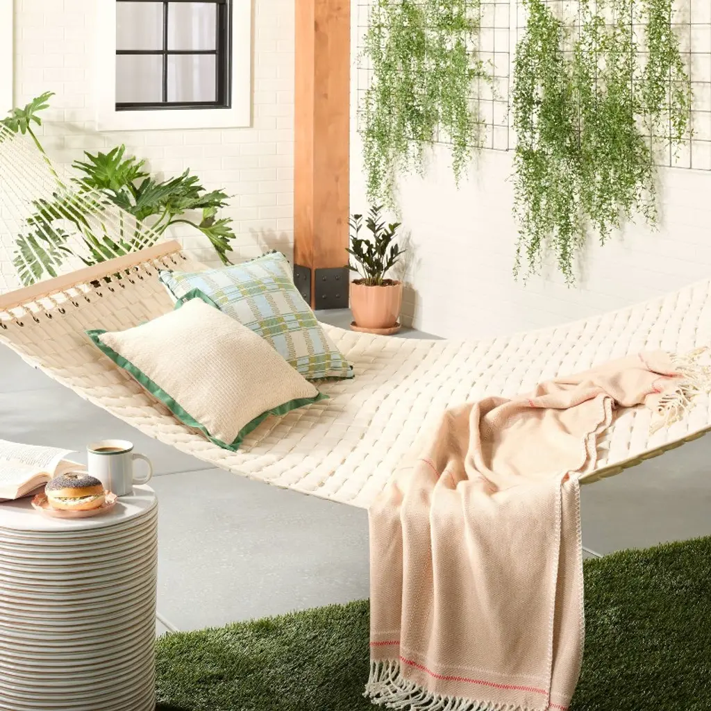 Give your seating a contemporary refresh with this Modern Plaid with Scallop Trim Indoor/Outdoor Square Throw Pillow from Hearth & Hand™ with Magnolia. This 18-inch square pillow is adorned with a modern plaid pattern that's complemented by scalloped trimming for a decorative look. Made of 100% polyester with soft filling, the throw pillow is great whether you choose to display it inside your home or as part of a patio oasis.Hearth & Hand™ with Magnolia: Gather ∙ Create ∙ Enjoy