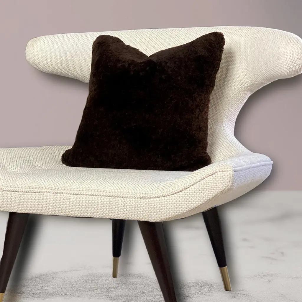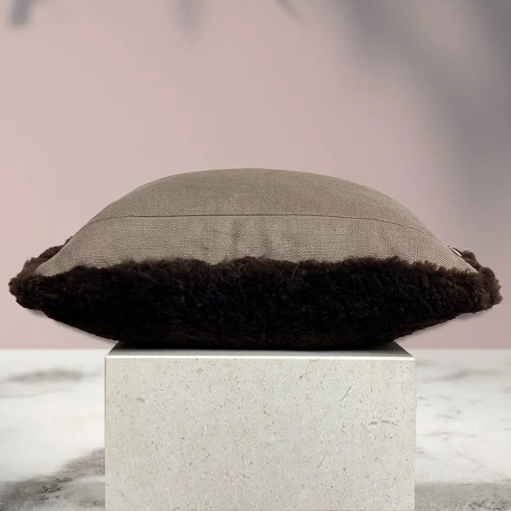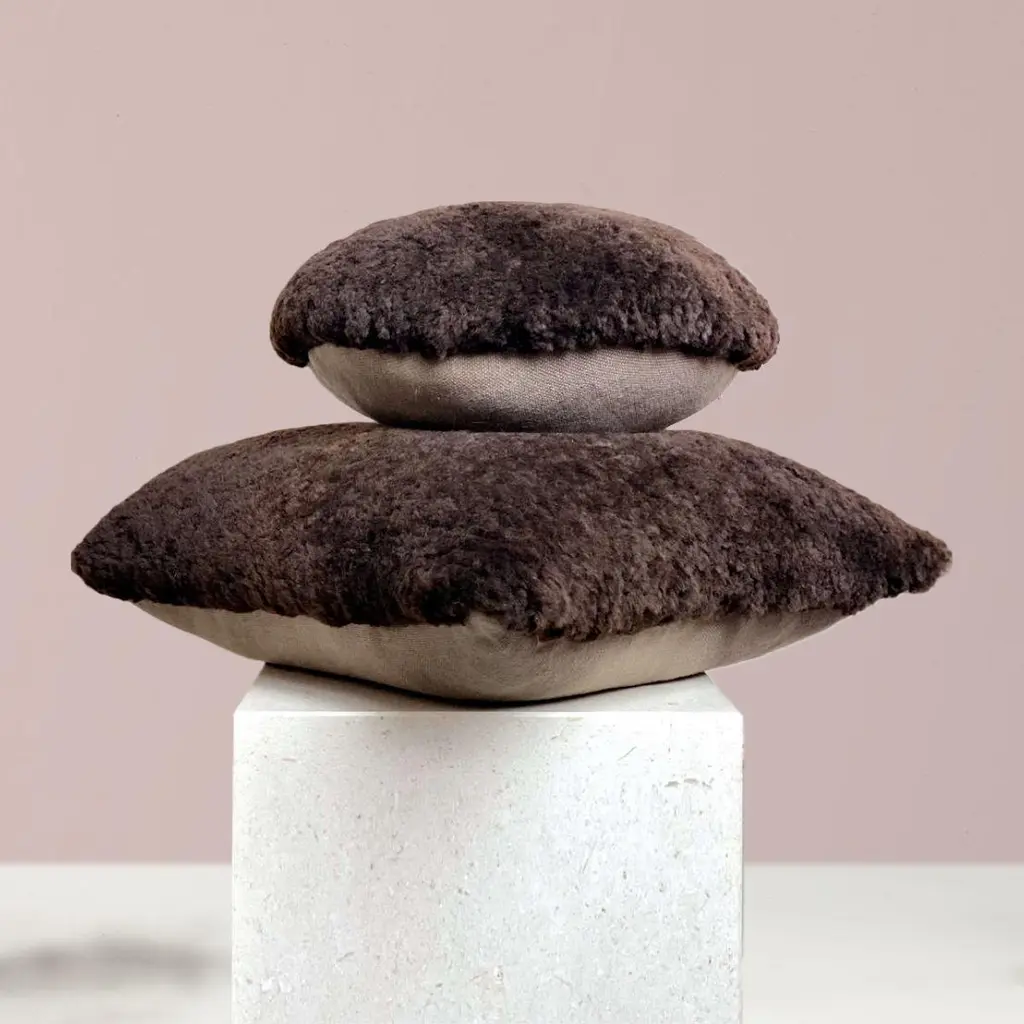Inject sumptuously inviting textures to your space with this luxurious, round fur pillow by Emily Barbara. Features decadent pure wool pile, exquisitely hand-crafted from irresistible double-shorn, New Zealand lambskin.Featuring delicious warm and dark brown hues, making each shearling pillow remarkably beautiful and unique, from the preserved natural coloring of the sheep wool.Translating sustainable, luxurious, and bespoke design each 16x16" square pillow comes with a silky plush sheepskin front, finished with a high-end European linen reverse, and fitted with a pure feather insert for additional luxe comfort. Crafted with craftsmanship, and available in assorted and custom-made pillow sizes sheepskin pillows, this collection of shearling pillows is designed and made in Australia. The brown pillows are sold as single units.Features:Double Shorn New Zealand LambskinColour: Chestnut / Natural BrownFront sided sheepskinReverse, high-end pure linenOverall dimensions: 18x18"Made in Australia Feather cushion insert includedNatural product:It needs to be celebrated that this shearling pillow is made from 100% natural products. Color variations and wool pile variations may occur between each sheepskin pillow.Product care for your Sheepskin Pillow:Professional dry clean onlyDo not wash or submerge into waterShake out often to remove dust or give a light vacuumSpot clean only with gentle wool detergent.Professional dry clean only.