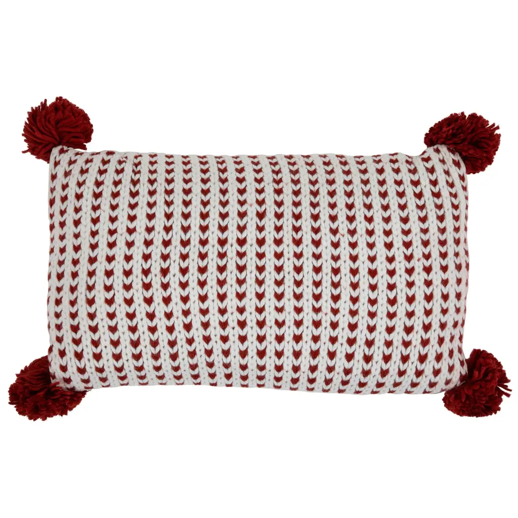Add a cozy touch to your living space with this delightful accent piece. Crafted with care, this pillow features a soft and intricate knitted design in a classic white and red color combination, perfect for both modern and traditional interiors. The rectangular shape adds a unique twist, making it a standout addition to any sofa, bed, or armchair. Adorned with playful and fluffy pompoms on each corner, this pillow brings a whimsical charm to your home decor. The knitted texture offers a pleasant tactile sensation, inviting you to sink into its plushness for moments of relaxation. Features: Color(s): white and red Acrylic knitted front with a velvet back Accented with red pompoms on each corner Perfect for your living area or bedroom Recommended for indoor use only Dimensions: 12” high x 19.5" wide Material(s): Shell: acrylic/velvet Filling: polyester