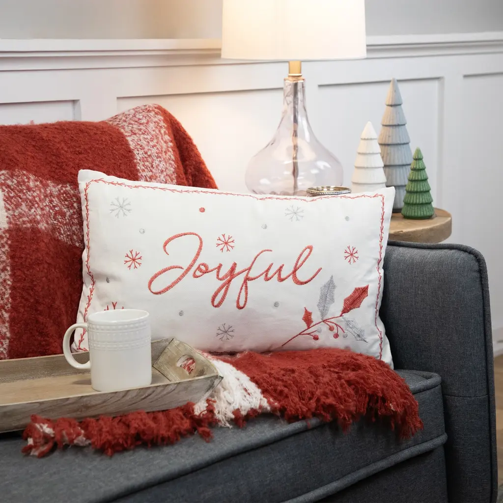 This festive pillow features intricate embroidery in vibrant red and white hues, showcasing the word "Joyful" surrounded by whimsical snowflakes and holly leaves accents. Its rectangular shape and generous size make it a perfect addition to your couch, bed, or favorite cozy corner. Crafted with care and attention to detail, this throw pillow effortlessly combines comfort and style, bringing warmth and merriment to any space. Product Features: Color(s): red, white and silver Designed with Joyful in red embroidered cursive letters Accented with embroidered red and silver snowflakes and holly leaves Perfect holiday accessory for your living area or bedroom For indoor use only Dimensions: 11” high x 19" wide Material(s): Shell: cotton canvas Filling: polyester