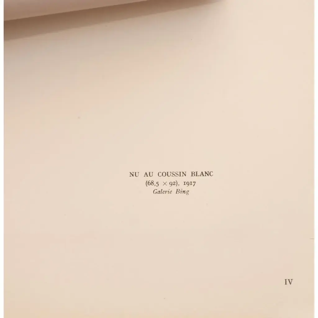 Adtunning First Edition offset lithograph, print, of painting "Nu Au Coussin Blanc" (Nude Reclining on a White Pillow, 1917) by Amedeo Modigliani. Comes from a first limited edition art folio published by Chene in Paris, France in 1947. Signed in the print. Printed on one side. Hand tipped-in on a board of heavy paper. Information regarding the original artwork will be found by lifting the piece. Numbered "IV" in lower right corner, on the board. Excellent condition - minor edge wear on the board, never framed. Image 11"W x 7.75"H
