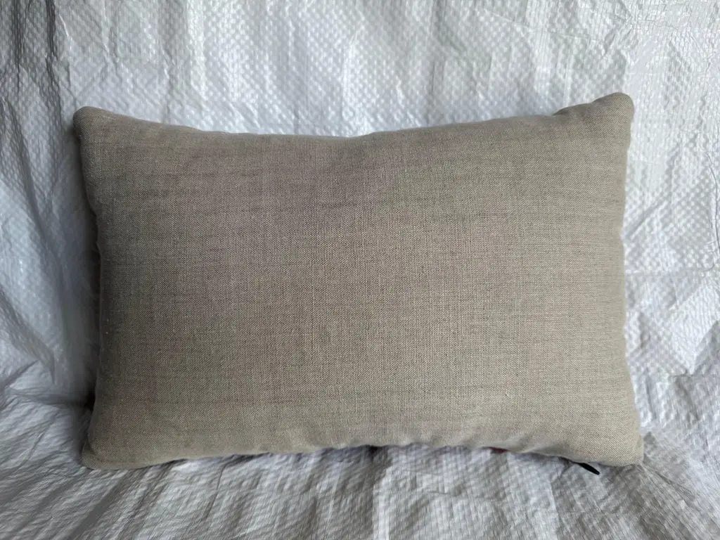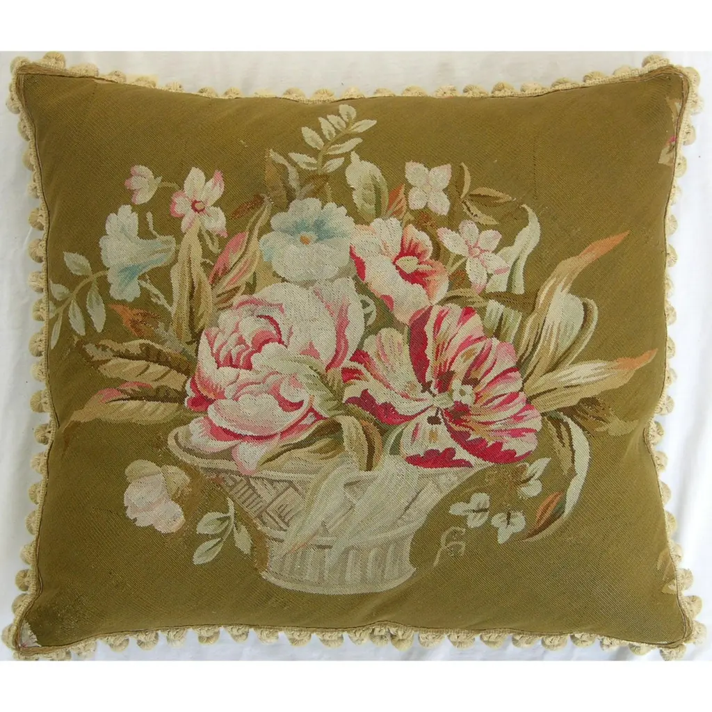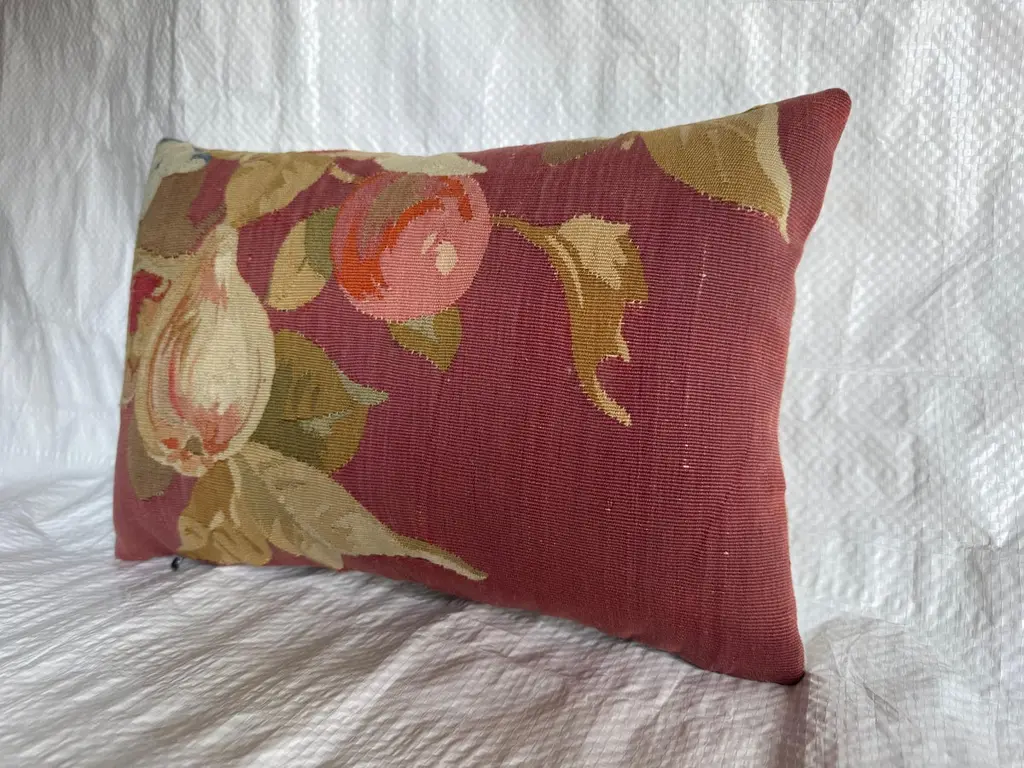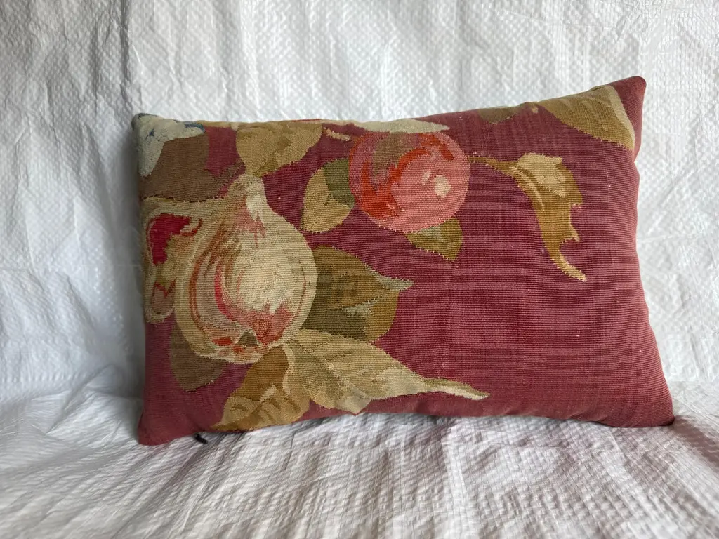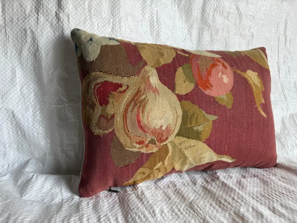 An elegant Aubusson tapestry pillow, handwoven in France circa 1850. This piece features a bold fruit motif with figs and peaches among foliage, woven in soft tones of cream, rose, and green against a rich burgundy ground.Aubusson textiles are renowned for their refined craftsmanship and painterly detail, long associated with aristocratic French interiors. This pillow has been carefully finished with a linen backing and down insert, preserving the historic woven front while making it suitable for modern interiors.