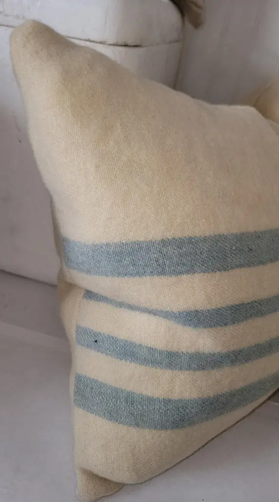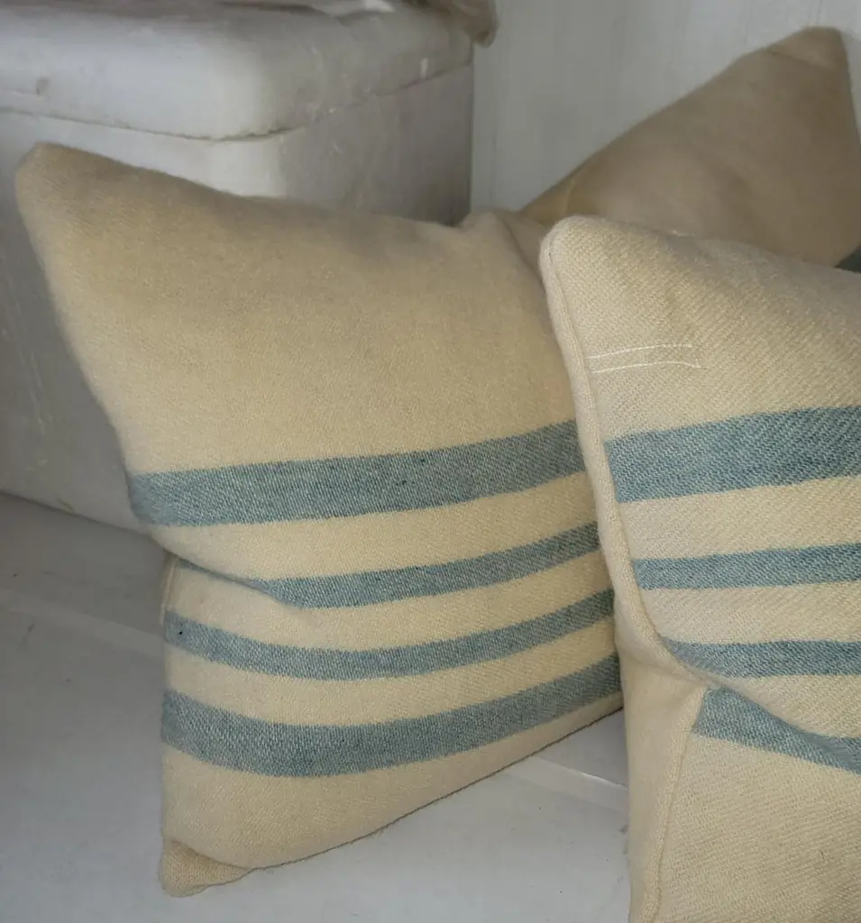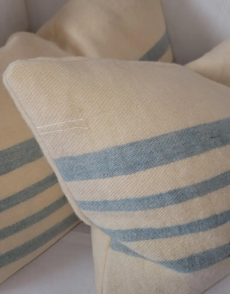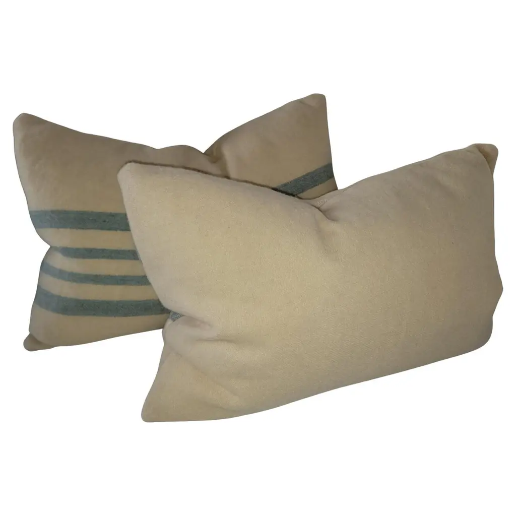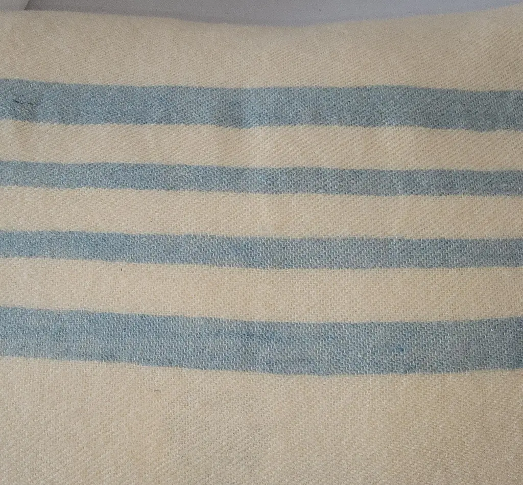 19thc Lambs wool hand crafted blanket with light blue stripes bolster pillows.The inserts are down & feather fill.Sold as a pair.2 pairs available.