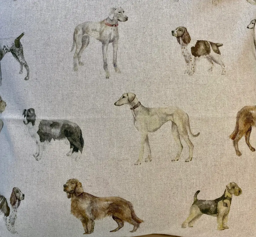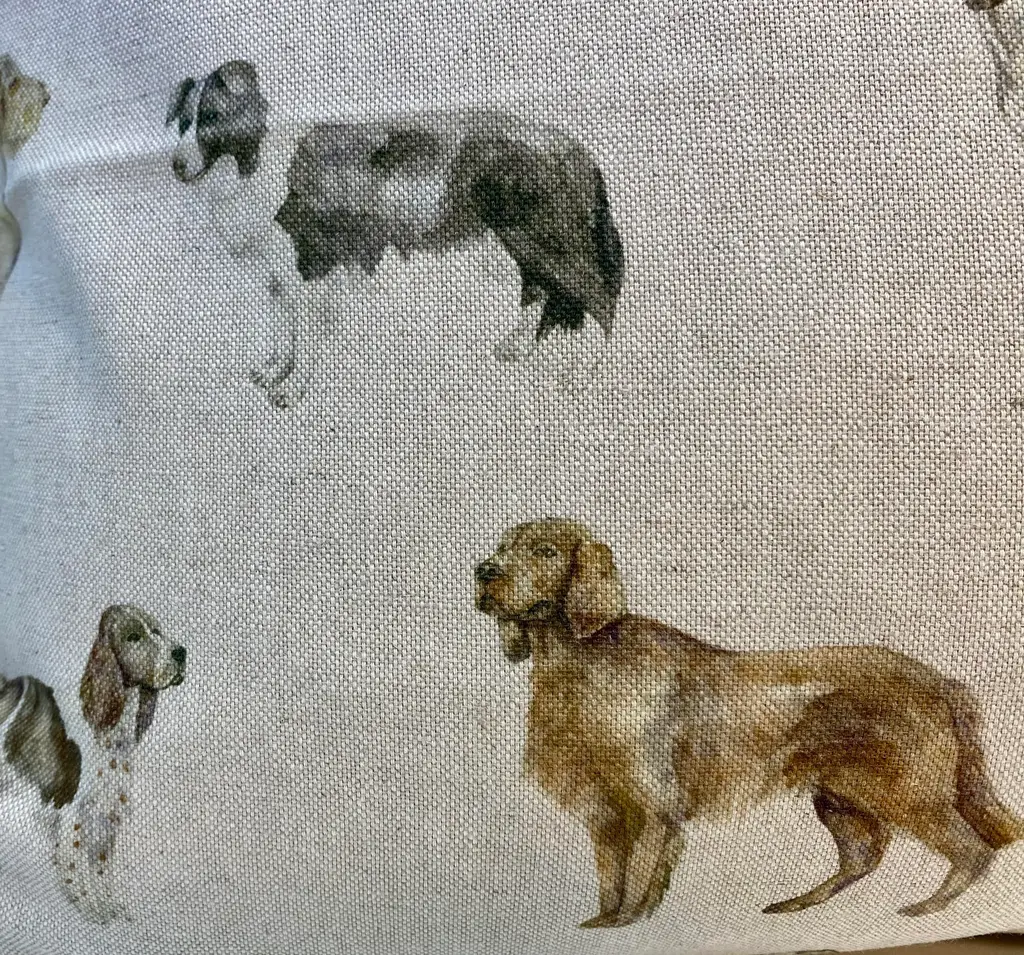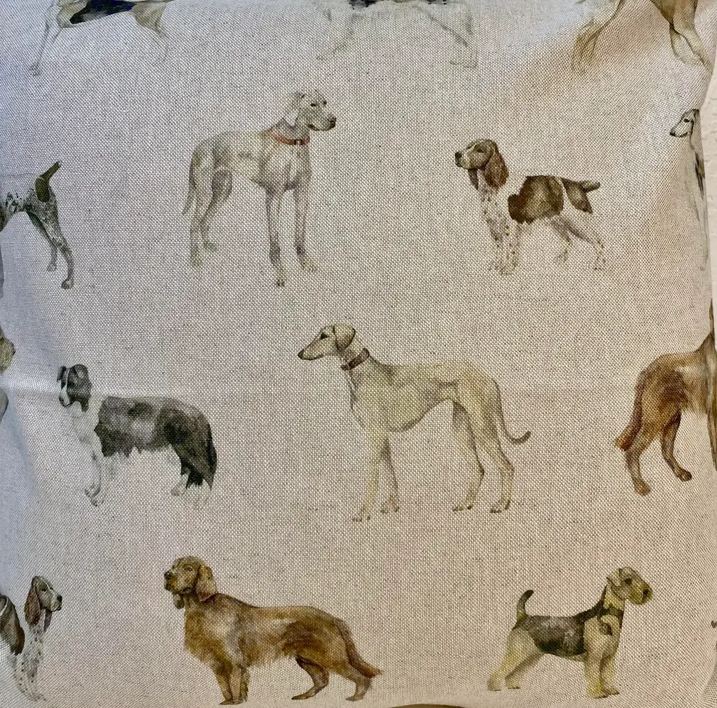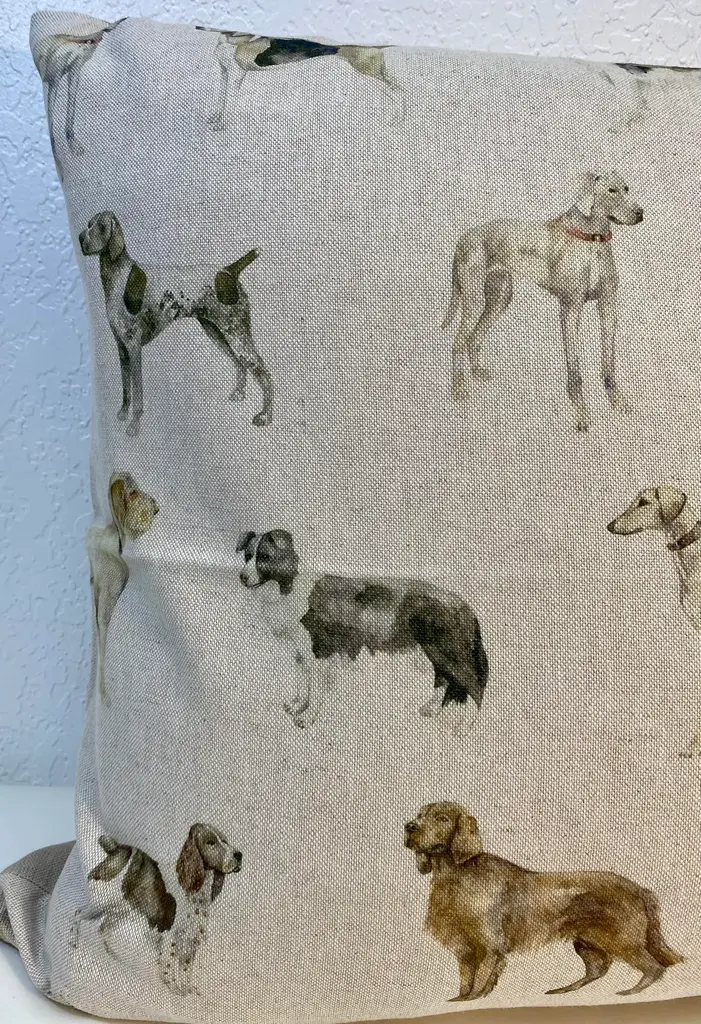 20” Square Pillow Adorned With A Print Comprised Of Various Dog Breeds - Made In U K. This pillow was made in Wales, U.K., by a small cottage designer/manufacturer owned by a lovely couple. The covers are made from discontinued upholstery material. So, once they are gone, you will not see these pillows again. They are truly unique. Each pillow measures 20” W x" 20" T x 7" D . The fill is larger giving the pillow a full look. Dry clean only. Pillows are sold only with insert. For other designs and sizes, please check our shop here.