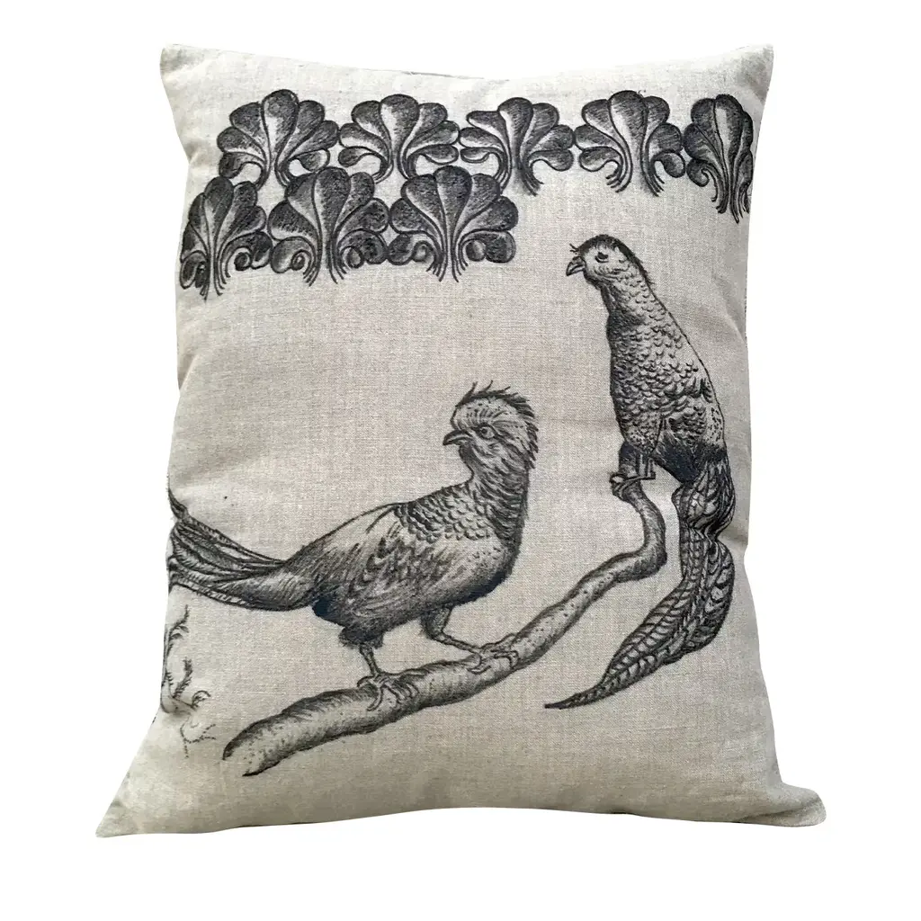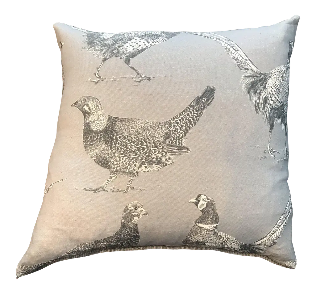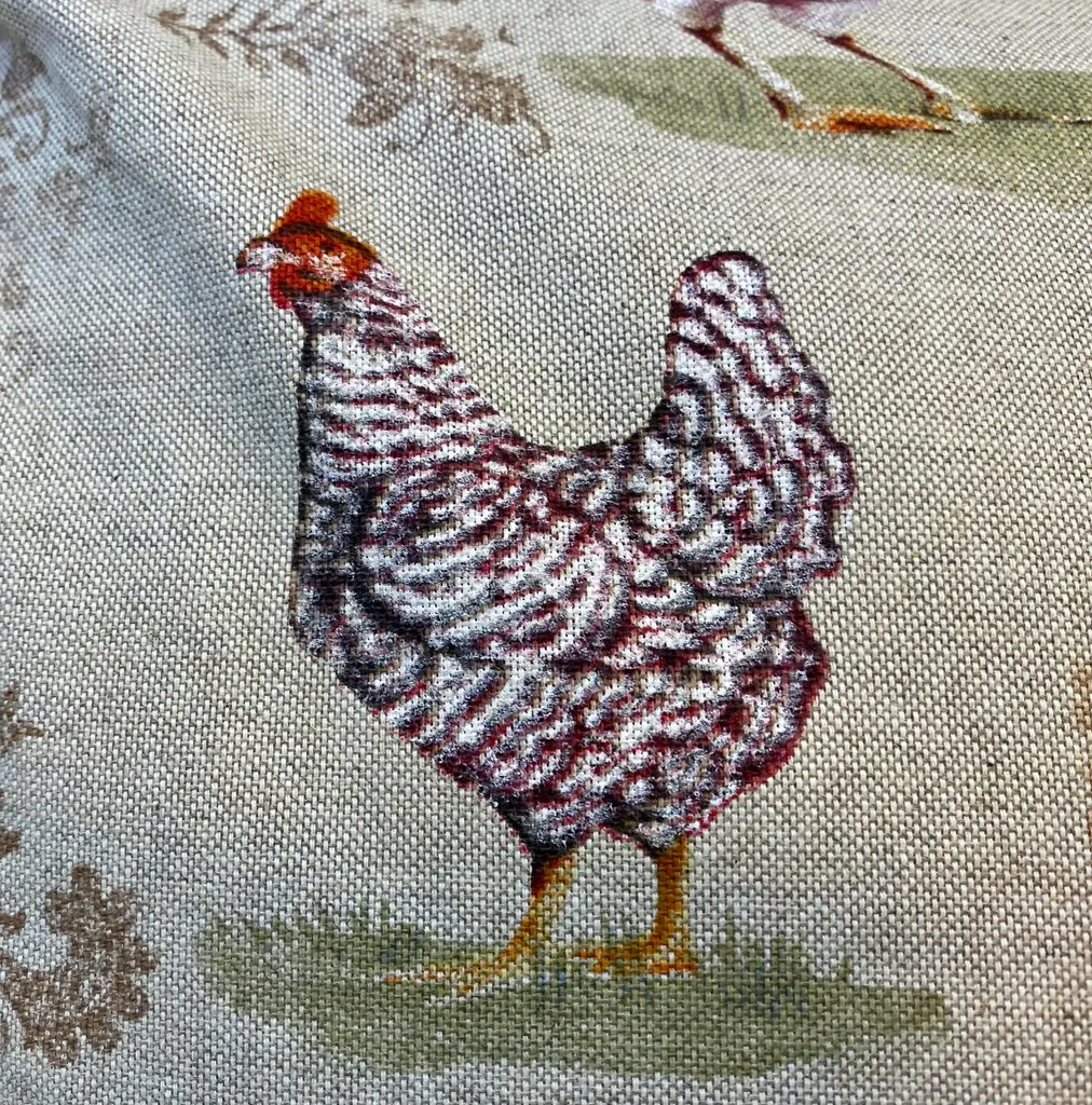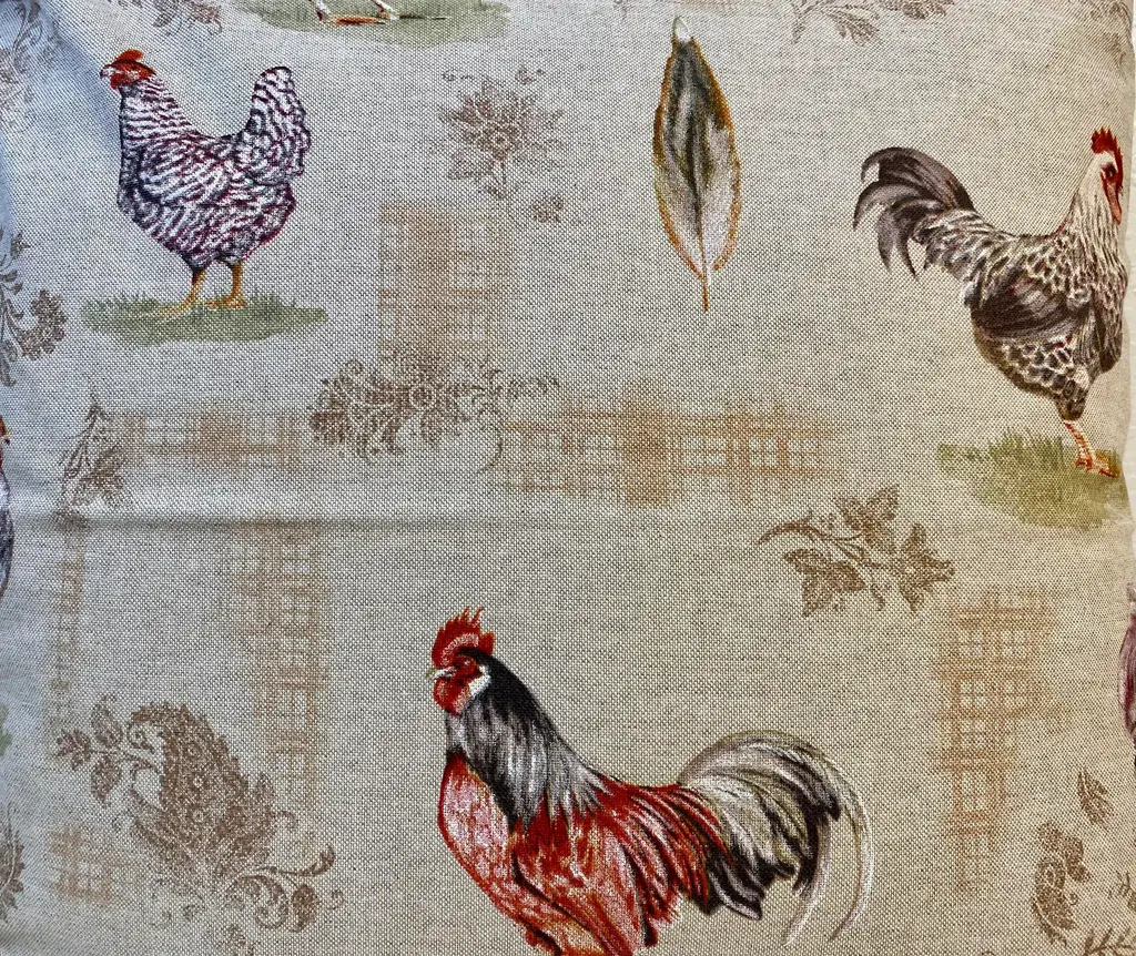 20” Square Pillow With Rooster & Chicken Print - Made in U K. This pillow was made in Wales, U.K., by a small cottage designer/manufacturer owned by a lovely couple. The covers are made from discontinued upholstery material. So, once they are gone, you will not see these pillows again. They are truly unique. Each pillow measures 20” W x" 20" T x 7" D . The fill is larger giving the pillow a full look. Dry clean only. Pillows are sold only with insert. For other designs and sizes, please check our shop here.