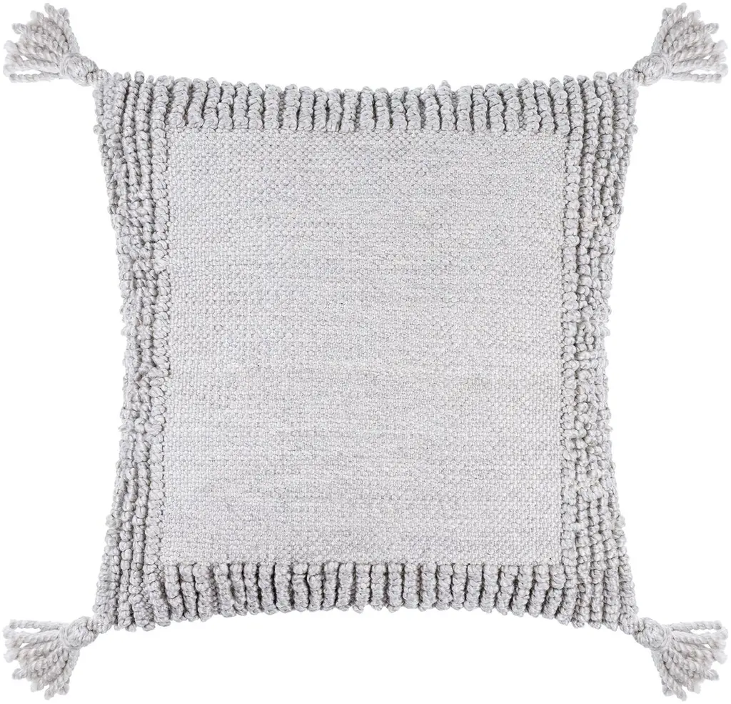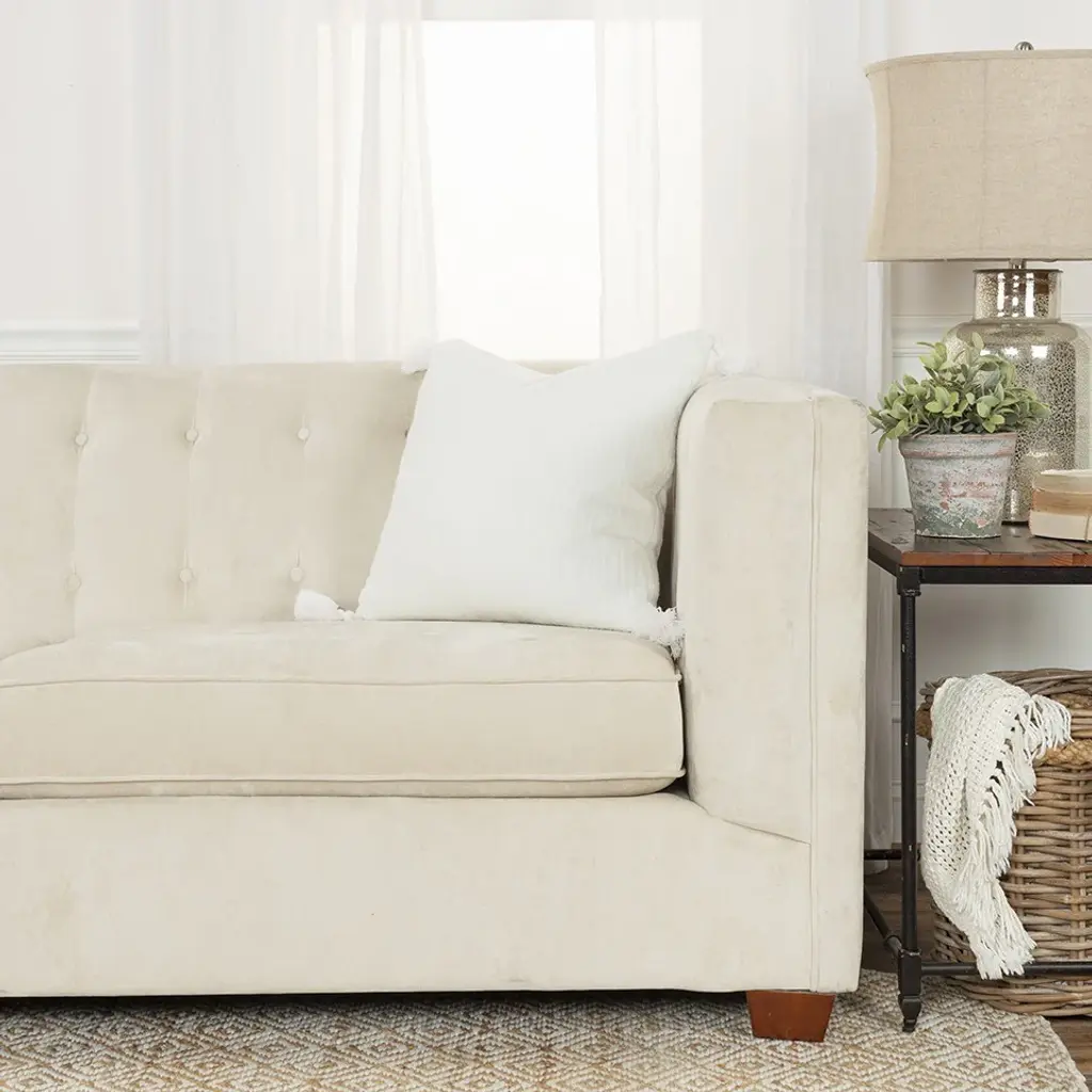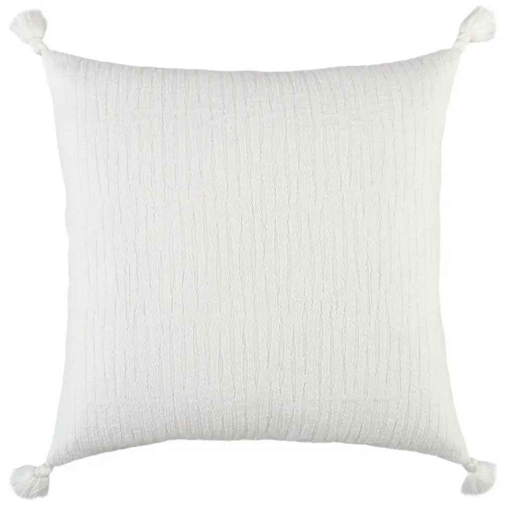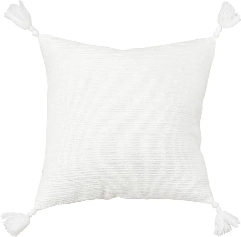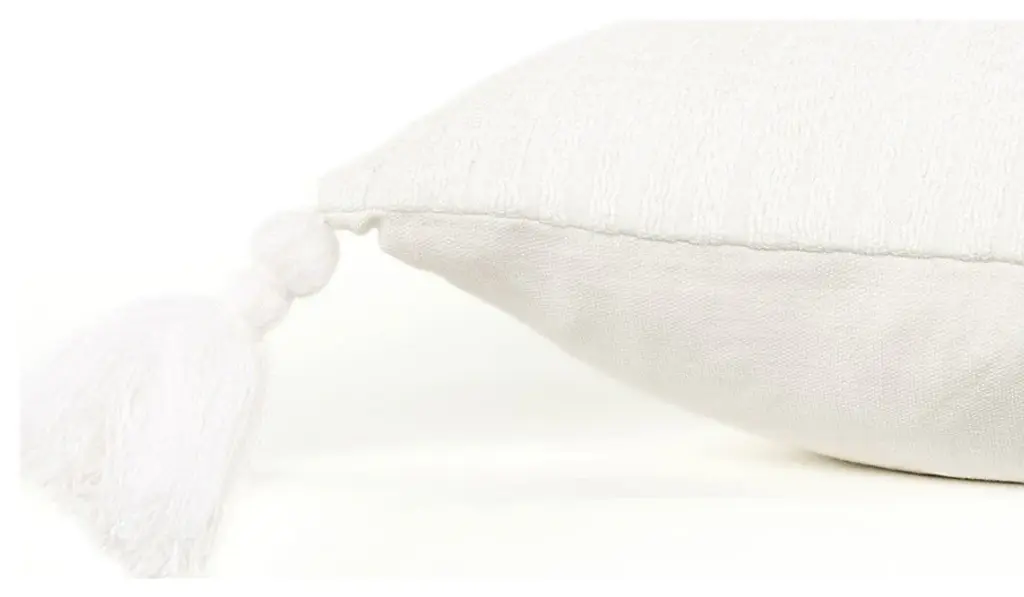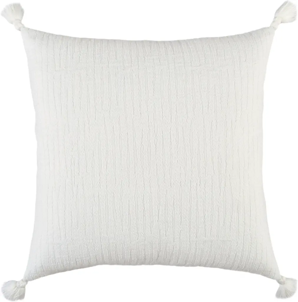Sophisticatedly modern with a bohemian flair, this White Solid Tonal Abstract Stripe Throw Pillow is an episode of style and simplicity to spruce up your living space. The solid white base features slightly raised abstract stripe patterning for texture while the four cotton corner tassels add a cheerful element to the pillow. Crafted from top-quality cotton fabric for enhanced durability and the polyfill insert makes it super soft, fluffy, and cuddly. The knife edging on the pillow ensures a clean and modern look to make it a suitable accent for a variety of interior styles. The solid coordination back sports a hidden zipper closure for convenience. Give your modern home a stylish visual appeal with this decorative throw pillow on the sofa or couch. 20'' x 20'' x 6.25''