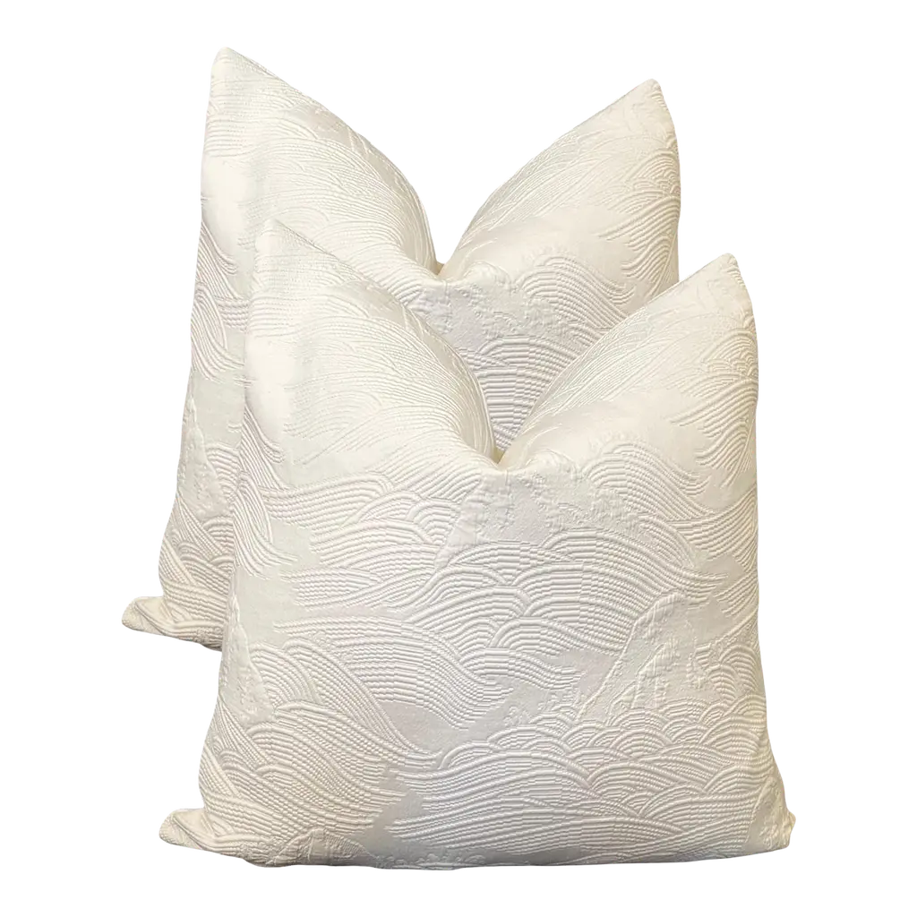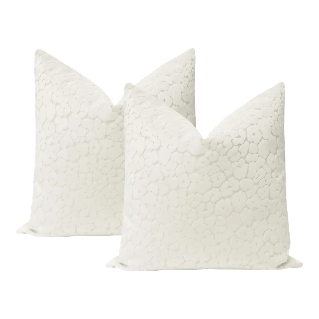 Pair of beautiful custom-made Leopard cut velvet pillows in Alabaster. Meticulously handcrafted with serged interior seams, invisible zipper closure, and extra full down feather inserts. Same sided, with fabric on front and back. Brand new condition.