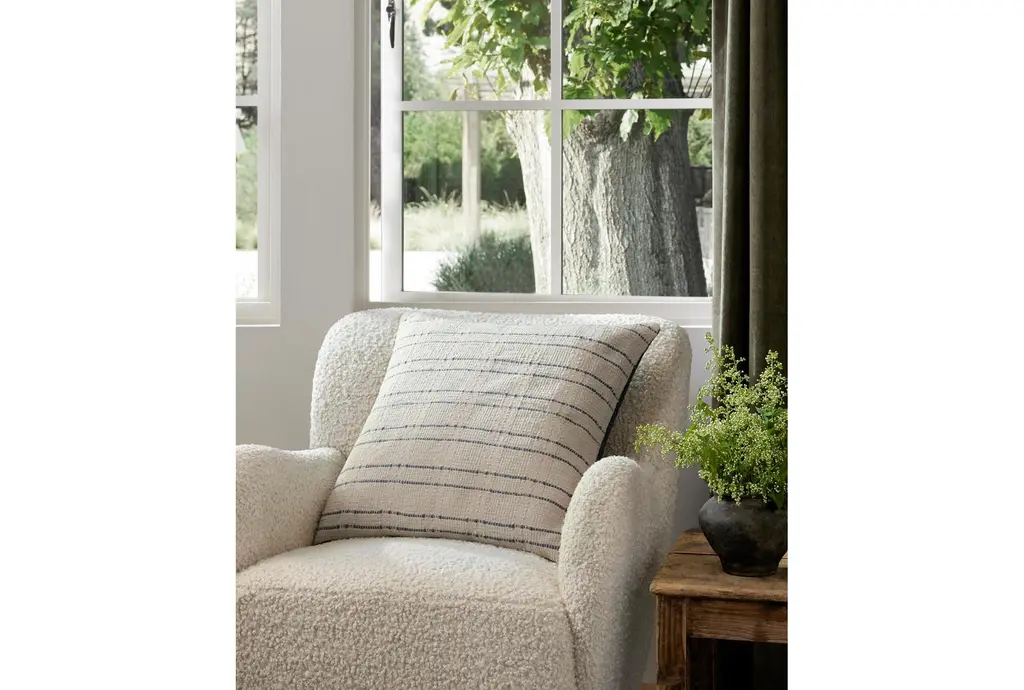 Enhance your living space with the 22" x 22" Cream & Blue Fabric Accent Pillow by Amber Lewis x Loloi. This decorative pillow features a soothing coastal style and subtle horizontal stripes that bring a touch of sophistication to any room. The down fill insert adds extra comfort, making it perfect for relaxing.