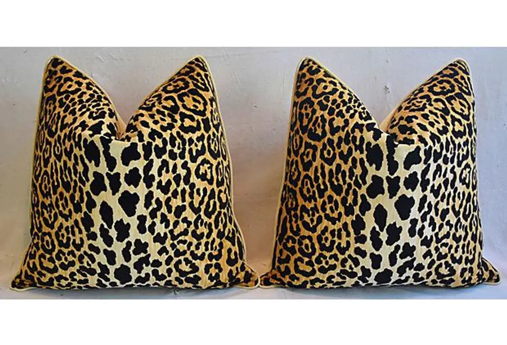 Pair of large 26" square custom-tailored pillows in a vintage/never used ultra-soft velvety cotton low-nap fabric depicting a safari leopard spot print. The pattern has been meticulously centered on each pillow. The pillow's backs are a new/never-used golden velvet fabric. Pillows are finished with a custom matching velvet cord trim, invisible zipper closures, and new plump generous goose down-and-feather inserts. Excellent new condition!!!!! ***PLEASE NOTE: I will combine shipping whenever possible if you purchase multiple items from my shop. Warm regards, Mike Seratt ***Also don't forget to take a peek at my other current listings...you just might find something you can't live without!!! It's easy just click on my name to the right of any listing highlighted in black "Mike Seratt of The Prized Pig" and presto it will bring you to my storefront!!! Cheers!!! Mike Seratt I SHIP OUT IMMEDIATELY, SO THE ESTIMATION YOU SEE FOR THE DELIVERY TIMELINE IS CHAIRISH'S OVERALL GENERAL TIMELINE, BUT I WILL GET THIS OUT THE NEXT DAY AND DELIVERY IS USUALLY 5-7 DAYS AT MOST