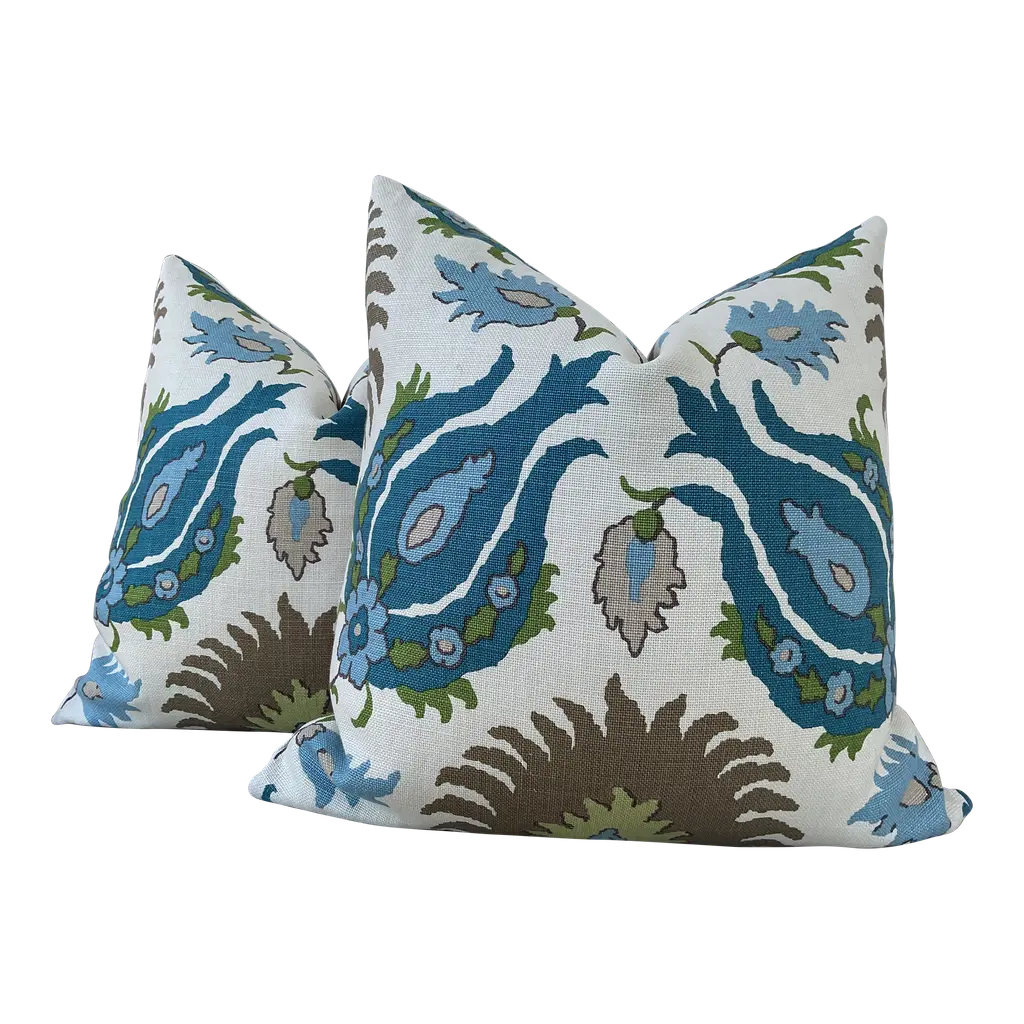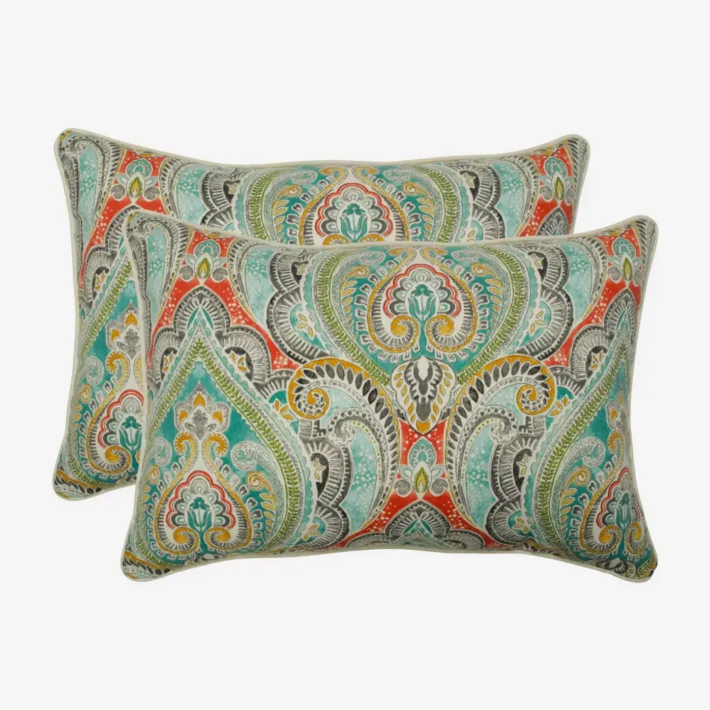 Make your patio the epitome of elegance with the paisley pattern of this set of two outdoor oversized lumbar pillows. Their intricate design is in lovely shades of coral, turquoise, green, yellow and gray, which emphasize every detail for a worldly look. Additional features of these outdoor oversized lumbar pillows include white contrasting welt cords for a clean finish and recycled polyester fiber fill with sewn seam closures. Also suitable for indoor use.