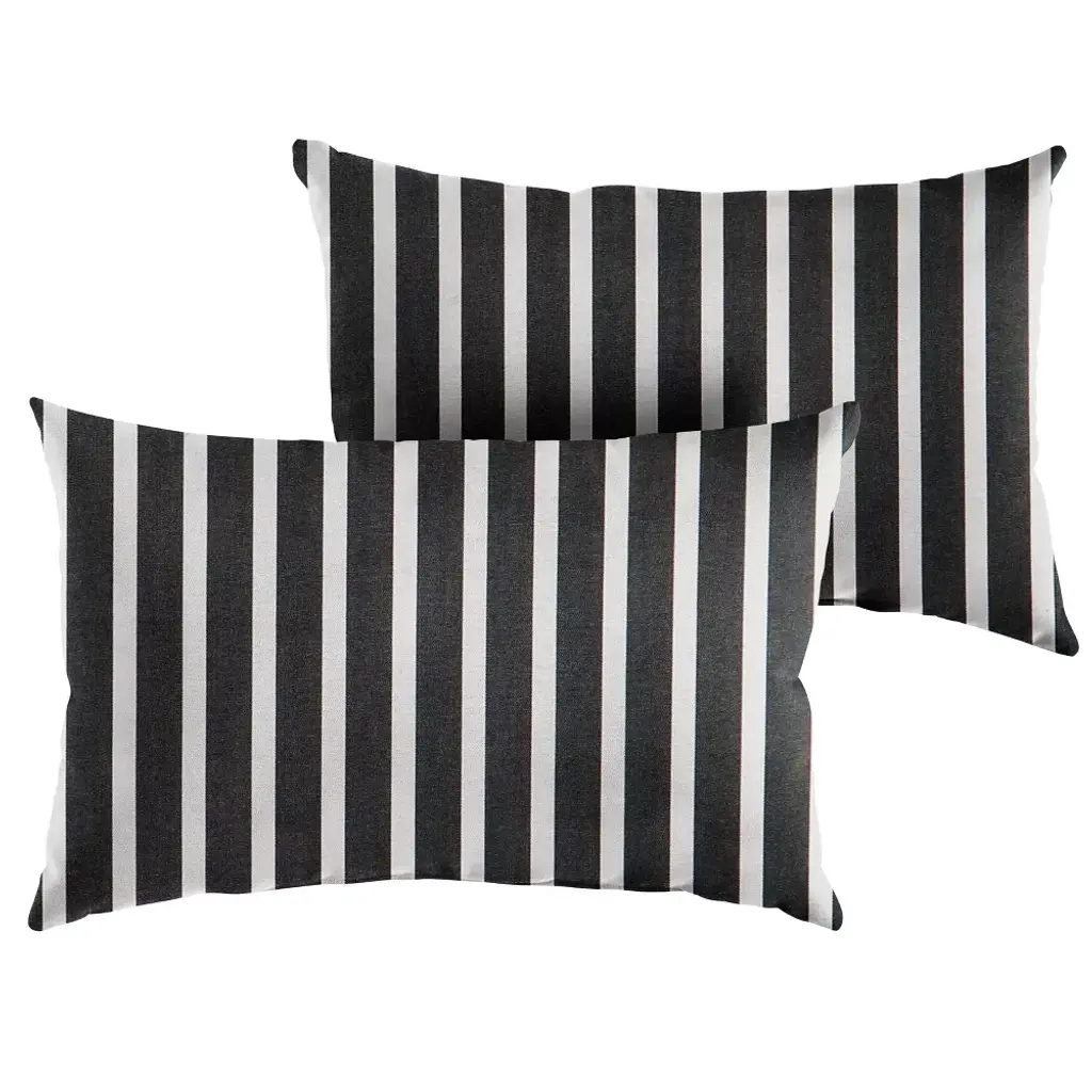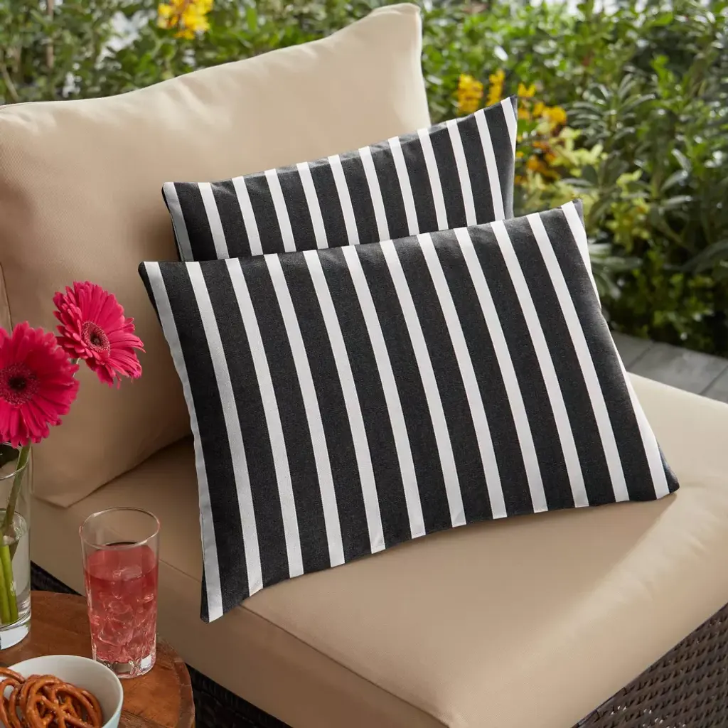 A pair of Stripe Outdoor Throw Pillows from Sunbrella instantly updates your outdoor decor with a pop of patterned appeal. Featuring an eye-catching pattern of black and white stripes, these pillows elevate the look of your outdoor space while blending easily with your existing ensemble. They're generously stuffed for an inviting surface that provides both comfort and support, and the knife-edge hem offers a tidy finish. Simply give them a home on a pair of reclining loungers or place on your outdoor couch — either way, these striped lumbar pillows are sure to be a welcome addition to your outdoor oasis. Sunbrella is a 100% acrylic fabric that is water resistant, spill resistant, and fade resistant. Ideal for outdoor use, Sunbrella fabric is UV treated for high-quality fade resistance.