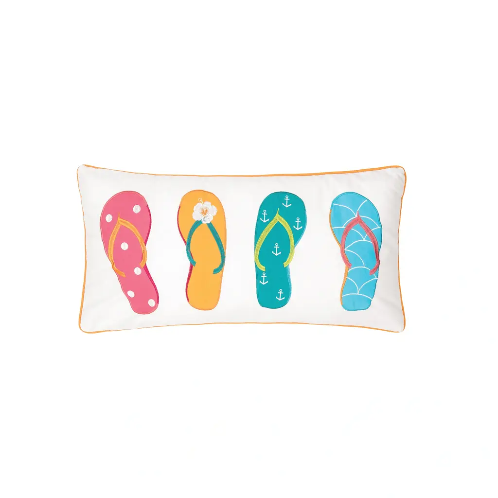 You don't have to live by the sea to bring coastal decor into your home. Featuring applique and embroidered, colorful flip flops, this cotton pillow from C&F Home will add refreshing touches to any room of your house. Finished with a coordinating orange piped edge and secured with a zipper closure. A removable polyester insert makes for easy care with this colorful pillow. Spot clean. Features: Set includes: One (1) Pillow Materials: 100% Cotton, and Polyester Color: White, Pink, Orange, and Blue Special Features: Featuring applique and embroidered colorful flip flops on a white ground Finished with a contrasting piped edge in tropical orange Crafted with a 100-percent cotton cover and polyester filling Filled and finished in the USA Closure type: Zipper Dimensions: Pillow dimensions: 4 inches high x 12 inches wide x 24 inches long This product will ship to you in one (1) box. Care instructions: Spot clean.