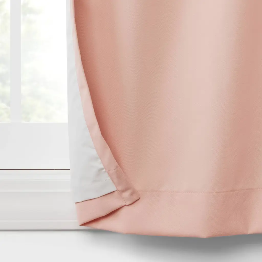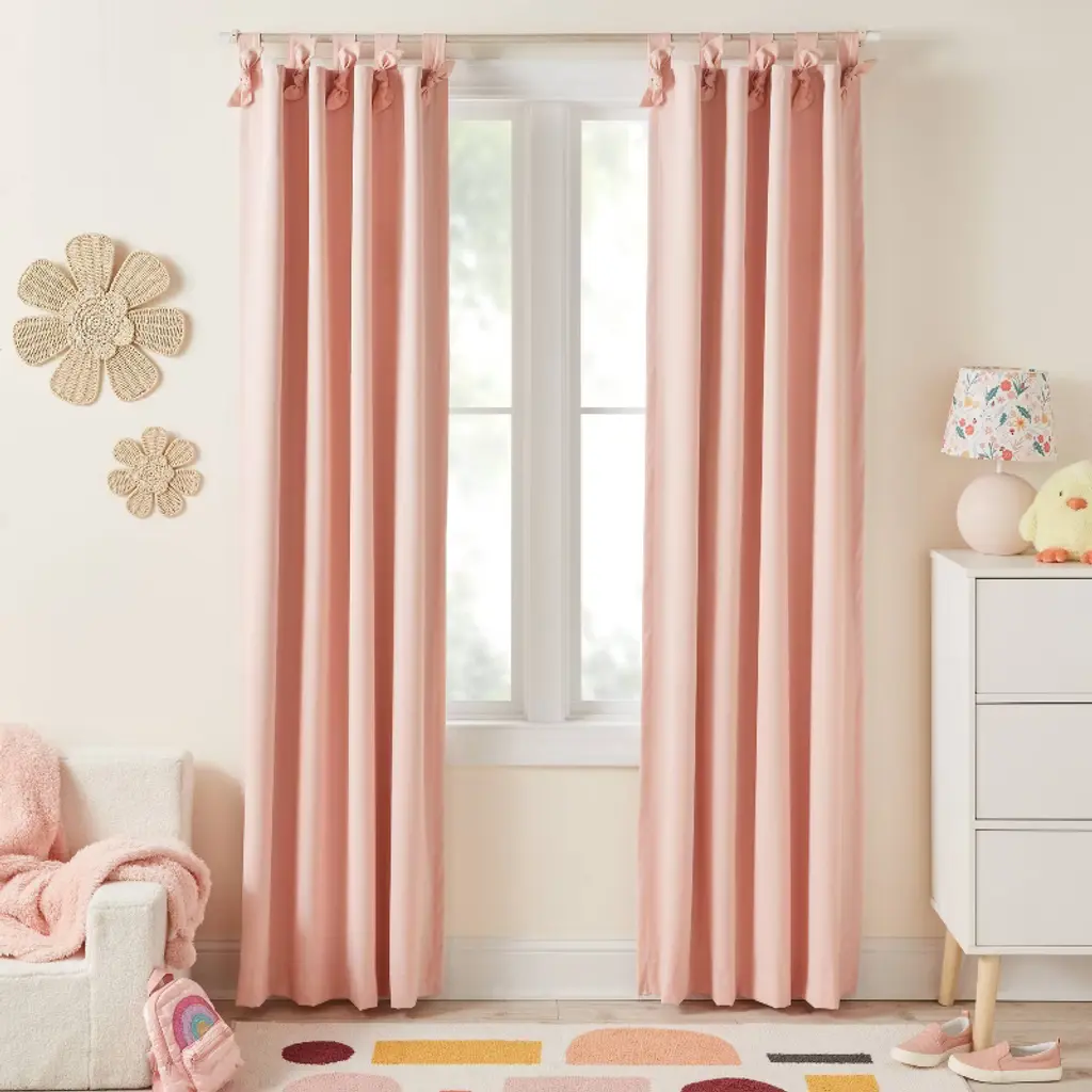 Add charming style to your kid's space while preventing early morning sunlight from entering with the Blackout Tie Top Embellished Kids' Panel with Ties from Pillowfort™. Made from recycled polyester fabric, these pink curtain panels help block out light and feature a tie top for an elegant look. Designed with rod pockets for quick installation, this embellished panel is machine washable for easy maintenance.