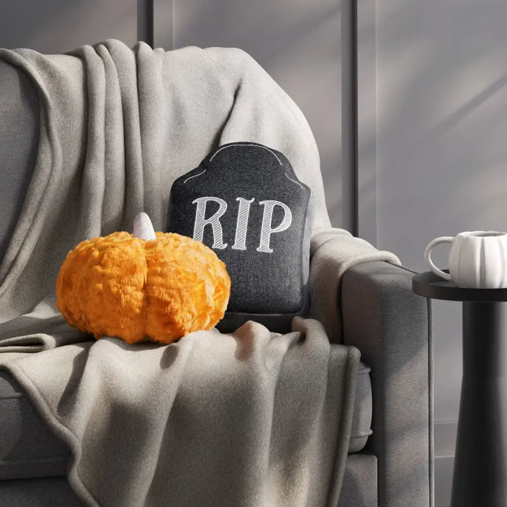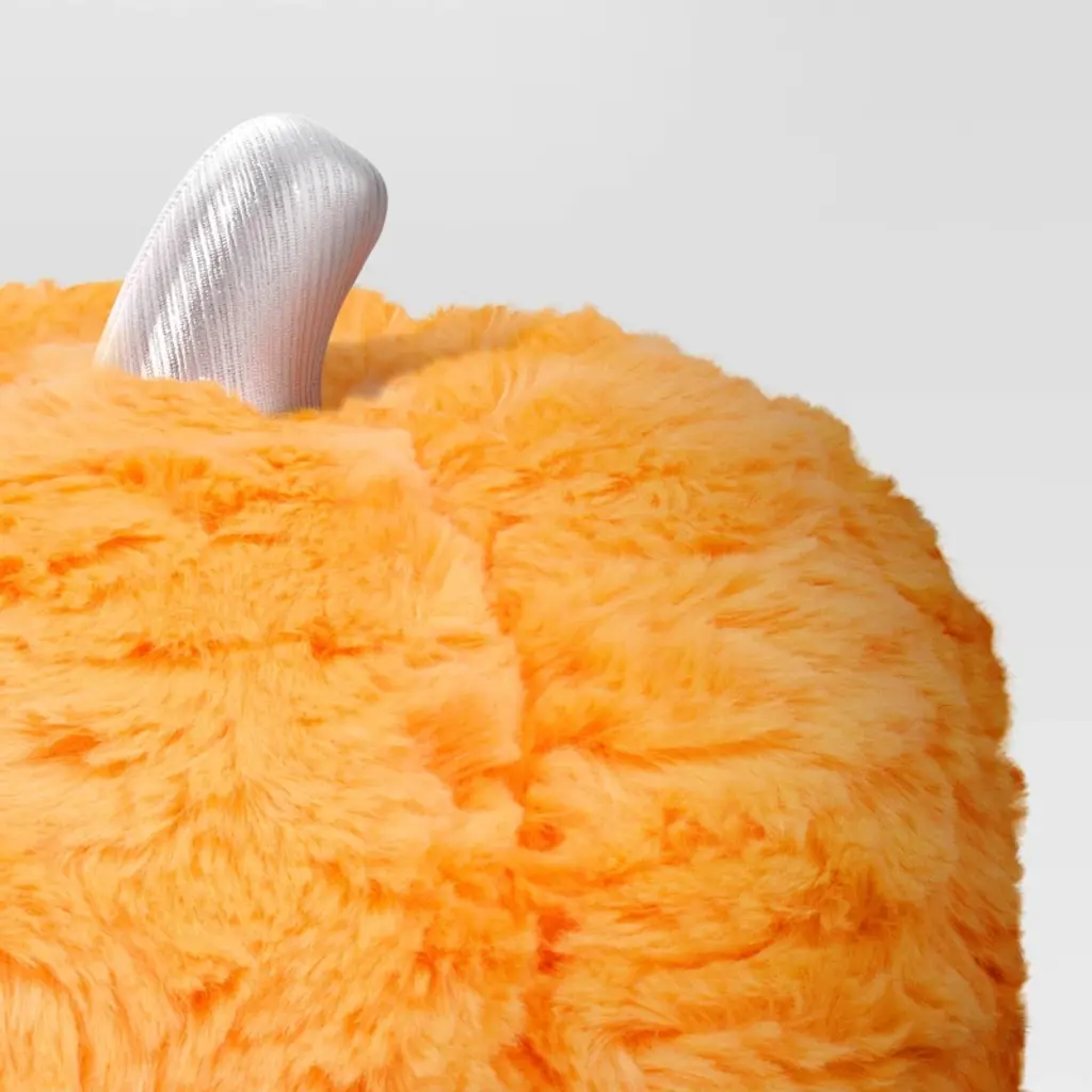 This 7.5-Inch x 9.5-Inch Novelty Shaped Plush Pumpkin Throw Pillow from Hyde and EEK! Boutique™ adds a cozy seasonal touch to your couch or armchair. Made from plush polyester fabric with filling, this throw pillow is designed as a classic pumpkin with a stem. Suitable for indoor and sheltered outdoor use, you can display it alone or arrange it with other Halloween-themed throw pillows.Hyde and EEK! Boutique™: Thrilling delights. Curious oddities.