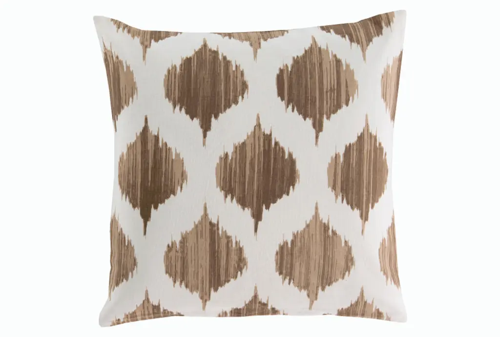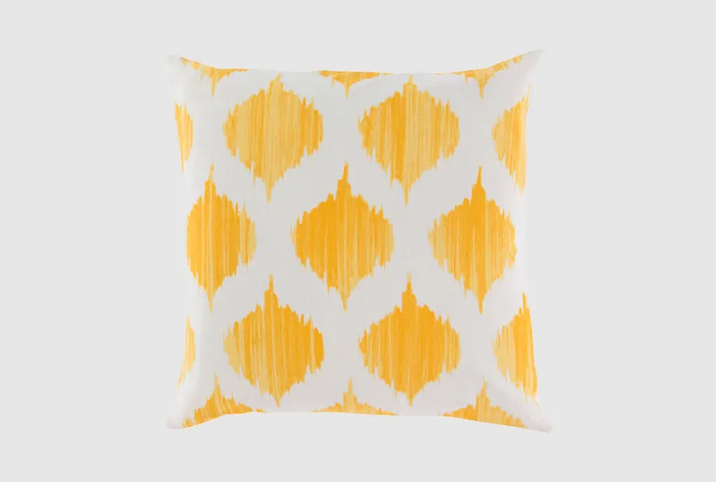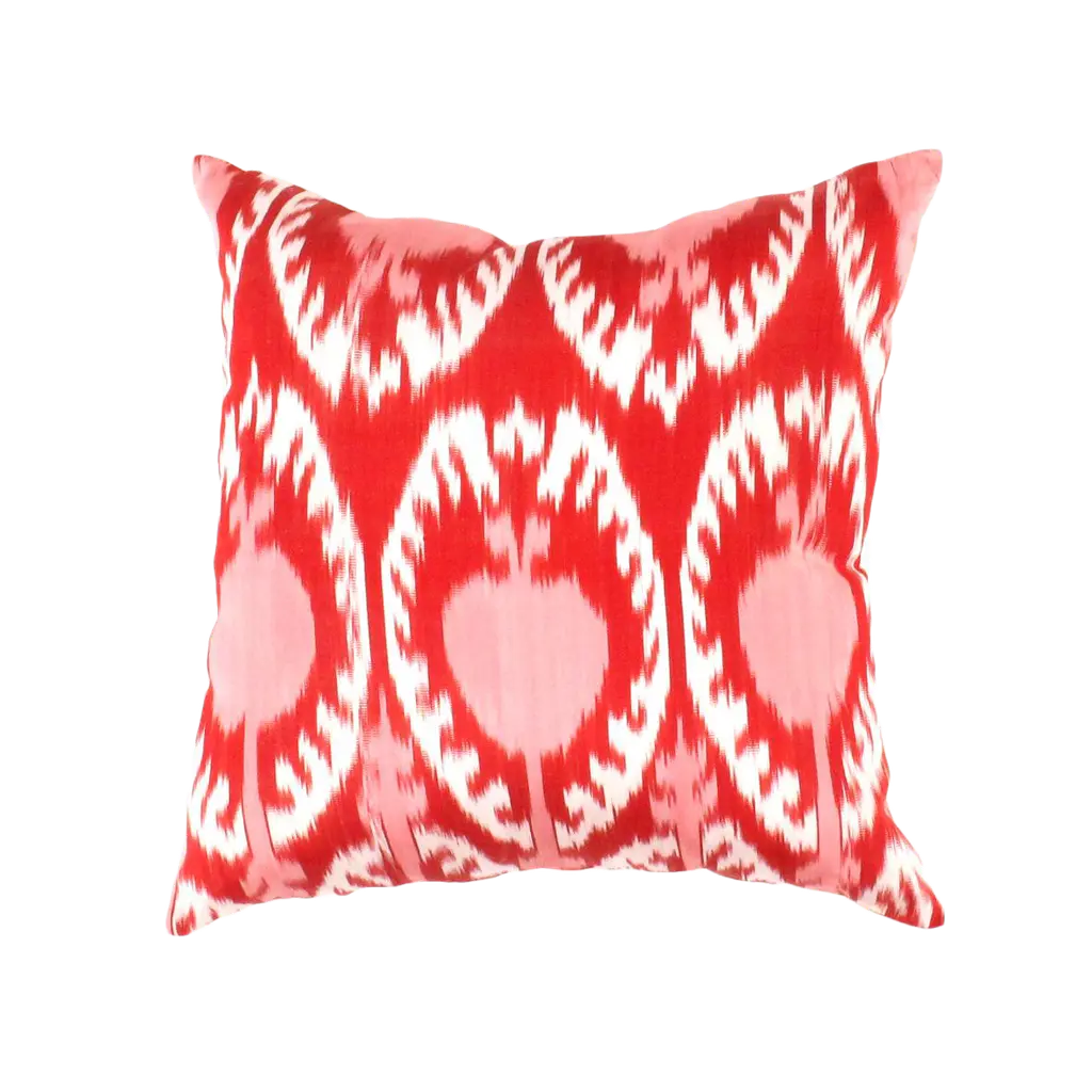 This accent pillow is a contemporary style, made in the USA with orange ikat fabric.