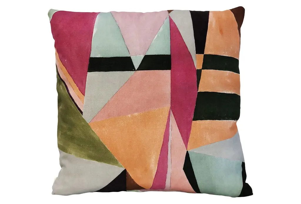 Add a vibrant touch to your nursery with the Accent Pillow- Seraphina Woven Fabric Geo Bright Multi 22X22 by Surya. This contemporary pillow showcases a stunning abstract pattern in bright yellow, aqua, white, bright pink, peach, and mint. It's perfect for brightening up any space with its colorful design.