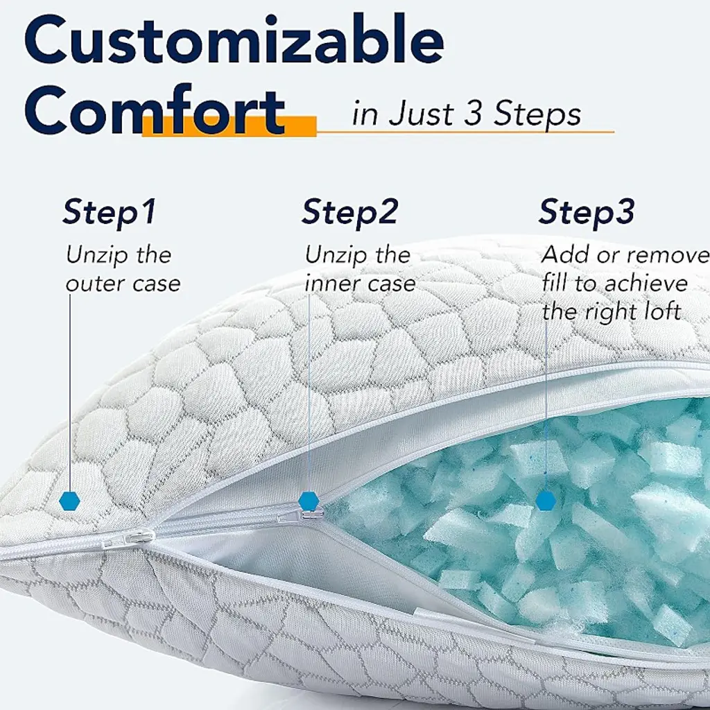 Innovative Cooling Technology - Are you tired of waking up night sweats, hot flashes? QUTOOL cooling pillow helps you resolve this. The cool pillow for hot sleepers is designed with double-sided cover for cooling & soft. The cooling side is made of cool ice silky fabric, which can spontaneously adjust the temperature by about 4 to 9_ instantly and reduce heat accumulation. The soft side is made of 60% Polyester and 40% Rayon derived from Bamboo, offering exceptional softness and excellent breathability. Best Cooling Sleep Experience - As we know, all fabrics used on bedding are affected by the temperature of their surroundings. To obtain the coolest sleep experience, we recommend using QUTOOL cooling pillow along with a cooling blanket or a cooling comforter in an air-conditioned room. This will provide you with a cooling, comfortable, and sweat-free environment, ensuring optimal sleep. It is perfect for those who sleep hot, experience night sweats, or hot flashes. It's a useful stocking stuffers for women men. Adjustable Loft and Firmness - Too hard, too firm, too soft, no support? QUTOOL adjustable pillow provides hotel-quality softness, and offers firm support. The hotel pillows feature a zippered inner and outer cover, you can ADD or REMOVE foam filling to suit your size, shape or sleep position, find the right comfort level and provide you with the ultimate sleeping experience. Suitable for side sleepers, back sleepers and stomach sleepers. Ideal as Christmas gift for loves. Ideal Christmas Gifts for Women and Men - Soft and supportive, just like a hotel pillow. The bed pillow is suitable for the elderly, office workers, teachers, students, and people of all ages, providing deeper sleep. It's a warm and thoughtful gift for retirements, anniversaries, birthdays, for women, men, moms, dads, grandmas, and grandpas, helping them sleep better and have a more energetic day. Perfect as a New Year's gift for a wife, Valentine's Day gifts for her or him, Mother's Day gifts, Father's Day gifts for dad, etc. RISKLESS & HIGH QUALITY GEL MEMORY FOAM - Our foam filling is Certified by CertiPUR-US (which can be found on the official website), no risk to your loved ones or family. We freshly manufacture our gel memory foam, avoiding the use of repurposed materials. It may have a slight odor, which is normal with new foam. Allow it to air out for about 1 or 2 days. With QUTOOL gel pillows, you can enjoy every peaceful night's sleep. It makes an great relaxation gifts for women men. Inside-Out Breathable Cooling Pillow - Shredded memory foam allows air to circulate smoothly within the pillow, and the cooling cover provides breathability and softness, enabling the queen-sized pillow to maximize air circulation while you sleep. You can finally wake up feeling refreshed. The cover is machine washable, ensuring your pillows stay fresh and like new. A must-have for bedroom essentials, dorm room essentials, and college dorm essentials.