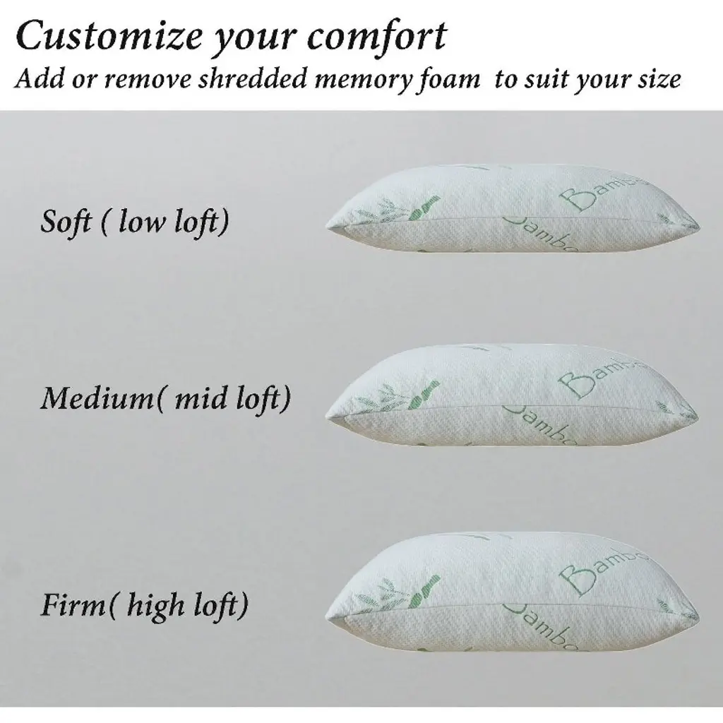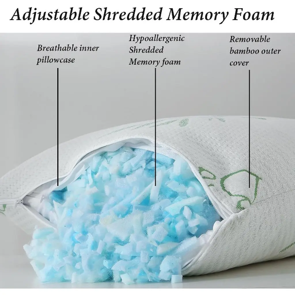 Shredded Memory Foam Bed Pillow Sets : If you are looking for firm, yet soft support bed pillows, these memory foam pillows king size with mix of Shredded memory foam and down alternative filling will give you prefect amount of firmness and supportive Adjustable Height and Support for All Sleepers : The memory foam fillings for the best gel bed pillow for sleeping can be added or removed to customize the height and firmness, no matter you are a side sleeper / back / stomach sleeper, enjoy the luxury experience of a five-star hotel at home every night Cooling Sleep Experience with Breathable Cover: our cooling pillow cover is breathable, soft and noise-free, cooling for hot sleepers, this material is also durable for years use, worth every penny of it Easy Care and Vacuum pack: The pillow case is zipper removable and machine washable, tumber dry on low temperature. Each pillow comes vacuum sealed and rolled flat, let the pillow air out for 24 hours, press, squeeze, fold for a while, or put it in the dryer for 3-5 minutes to make it fluffy