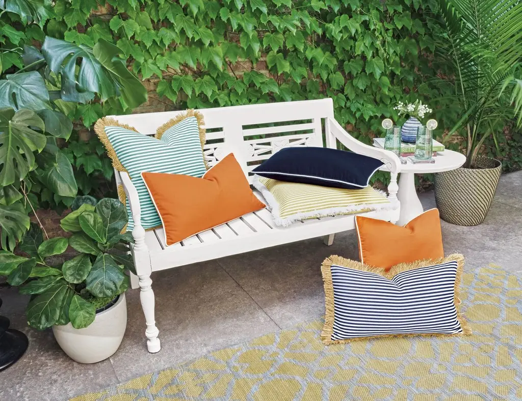 Designed by us and available only at One Kings Lane: With its tailored stripes and flirty fringe, this outdoor pillow is certain to bring both comfort and flair to your porch, patio, or sunroom. Insert included.