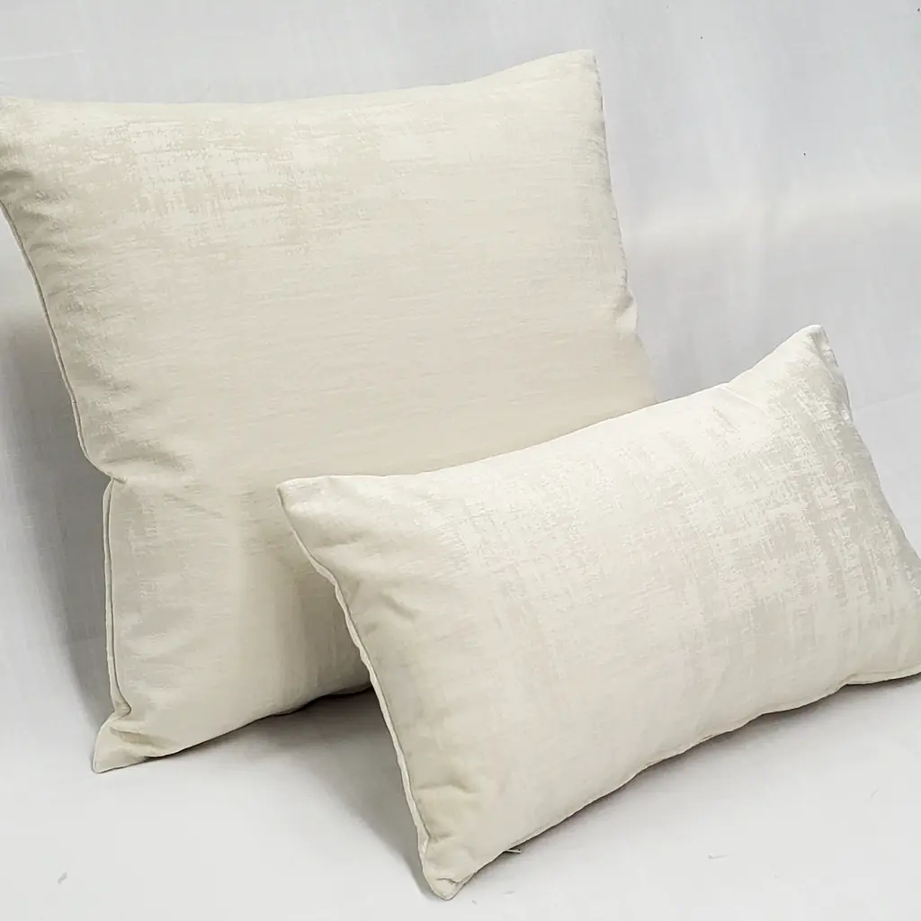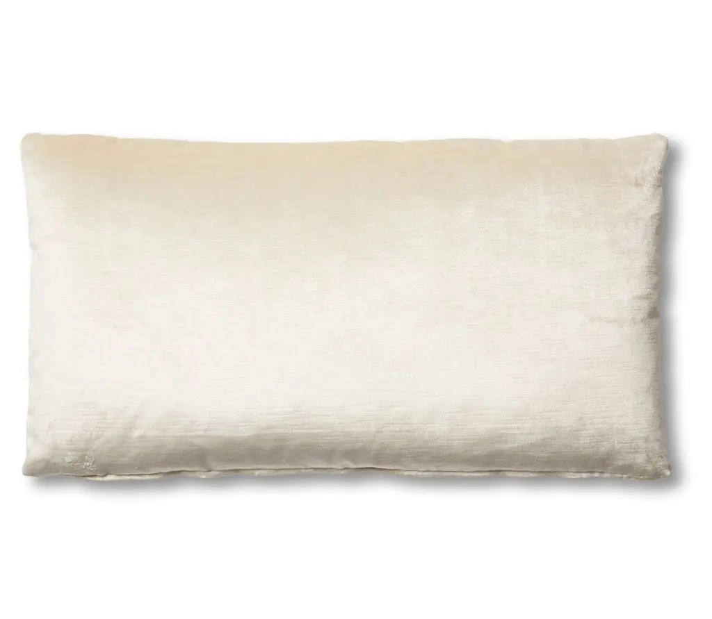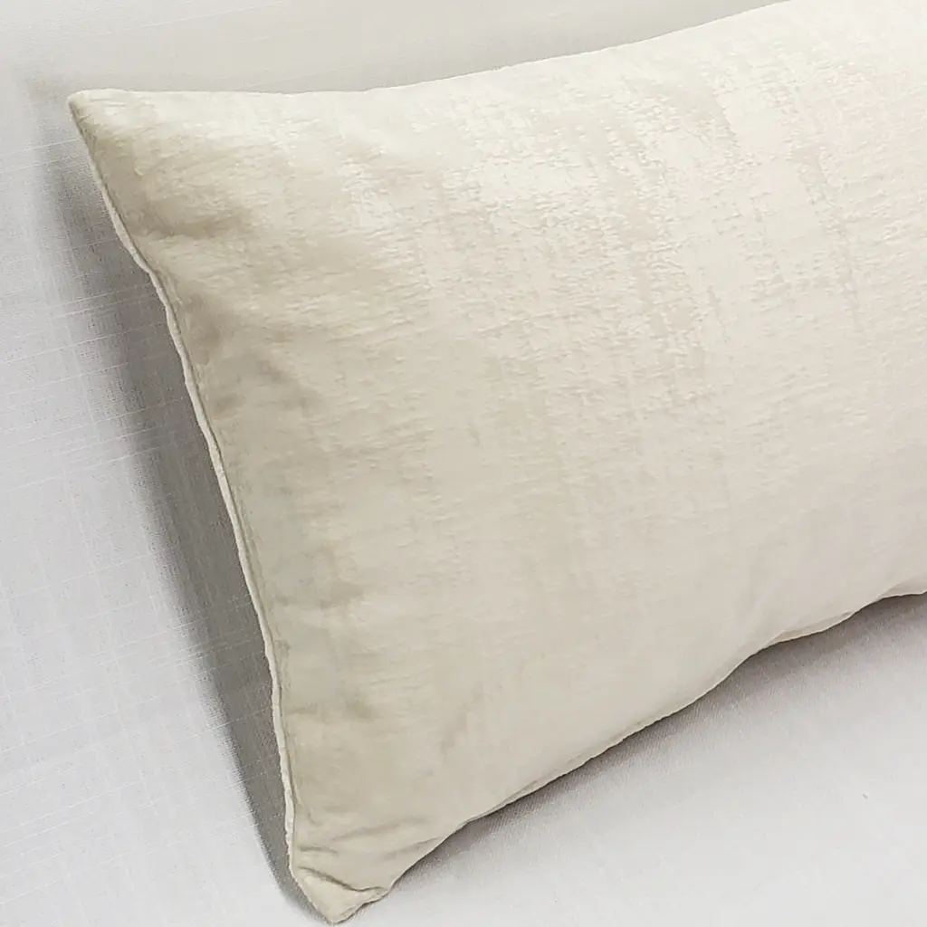 The velvety-soft rectangular Alabaster Stucco Cream Throw Pillow is a solid, cream-colored velour pillow with a beautiful, mottled texture and appearance. Perfect for any room in the house, this cozy pillow is all about comfort. Size: 12"x20" Rectangular Fabric: 100% Polyester Same fabric on front and back Knife edge seams. Inside seams are serged for strength and durability. Hidden zipper closure Cold water wash separately on delicate. Air dry Benjamin Moore best color match (Acadia White OC-38 - Color Preview Palette) Made in Canada: Designed and made in Pillow Decor's Vancouver workroom.