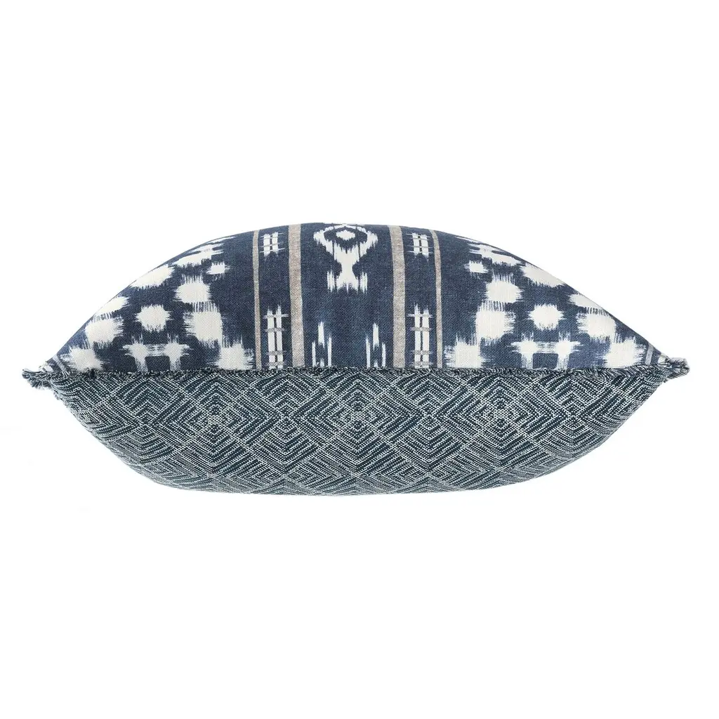 Elevate your living space with this decorative pillow featuring an exquisite ikat pattern. The pillow is backed in a solid fabric and finished with a brush fringe edge, adding a touch of elegance to any room. It includes a pillow insert and a convenient zipper closure for easy care. For best results, dry clean only.