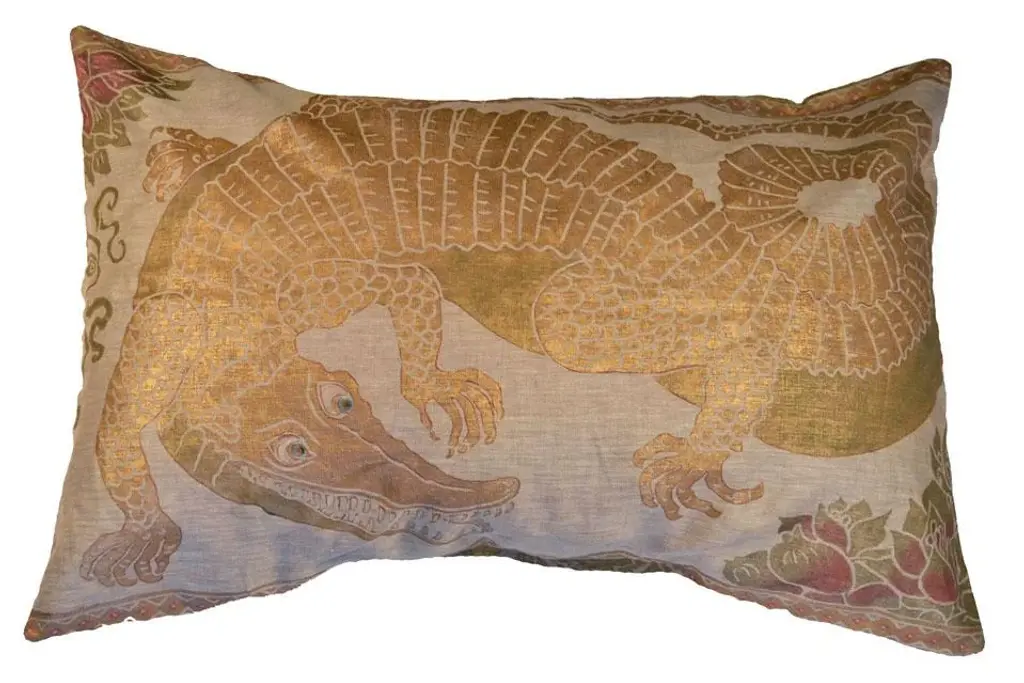 Via Venezia Textiles" extravagant pieces reflect a brilliant infusion of hand-dyed and hand-painted colors and designs that come crashing through every piece with old world and modern charm, while cultivating chic connoisseurship based on ancient motifs and architectural designs from around the world. Via Venezia Textiles features hand-dyed silk velvets and linens that have been created using illustrated wooden blocks, which in turn have been carved and painted entirely by hand to adorn pillows and other decorative linens. The final result is a one-of-a-kind masterpiece of Venetian artistry that is fit for a palace, creating a style like none other for each of its collectors. This pattern comes from a 16th century engraving of an exotic alligator turning its tail. The studio will come as close as possible to the requested size and color. Any variation will be due to the custom nature of the paint mixture, size of the blocks, and to avoid any compromise in the design. Pillows are made with a zippered closure and are shipped flat. We will gladly recommend insert manufacturers.