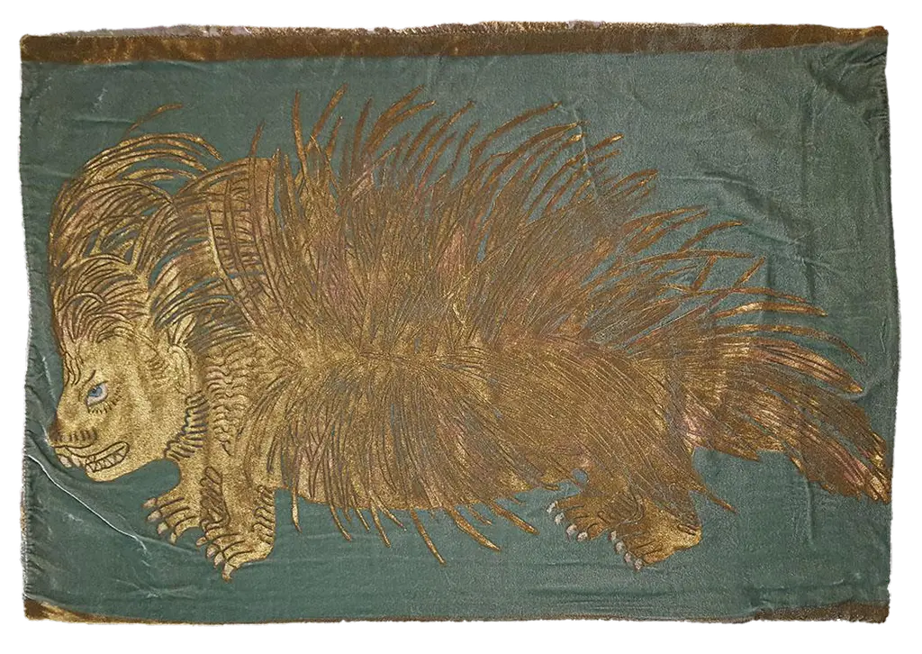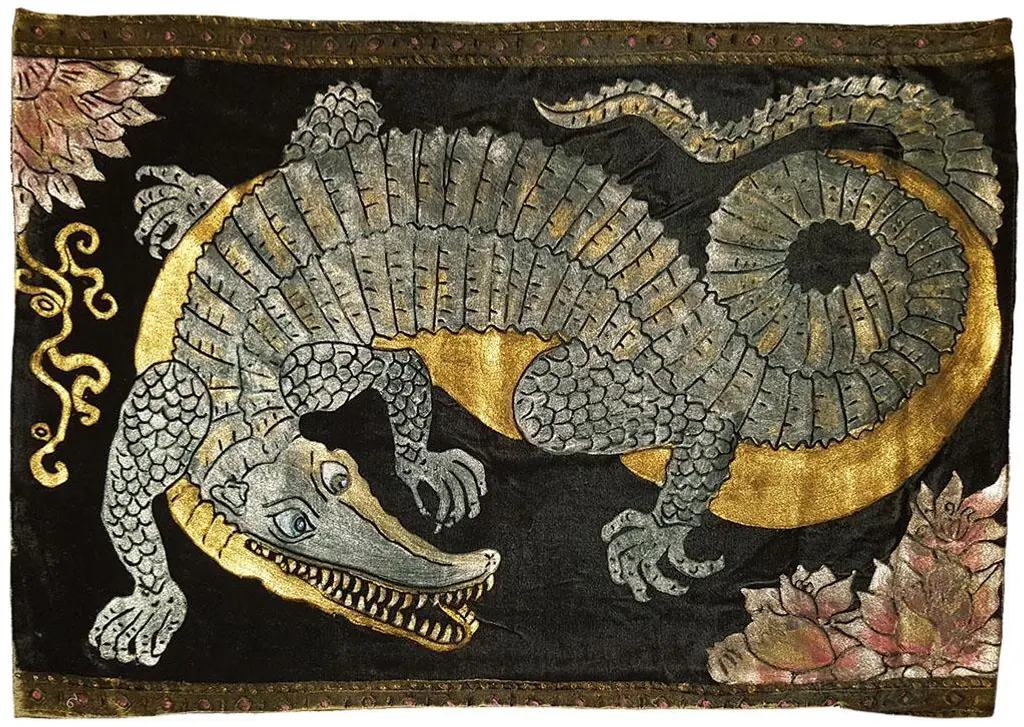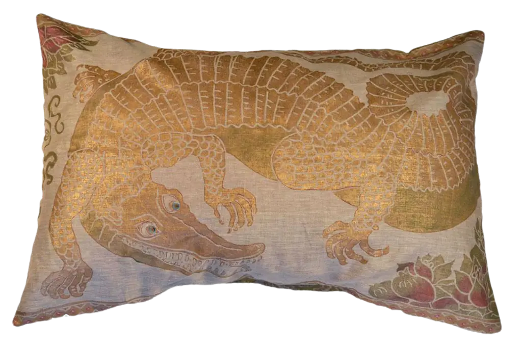 Via Venezia Textiles" extravagant pieces reflect a brilliant infusion of hand-dyed and hand-painted colors and designs that come crashing through every piece with old world and modern charm, while cultivating chic connoisseurship based on ancient motifs and architectural designs from around the world. Via Venezia Textiles features hand-dyed silk velvets and linens that have been created using illustrated wooden blocks, which in turn have been carved and painted entirely by hand to adorn pillows and other decorative linens. The final result is a one-of-a-kind masterpiece of Venetian artistry that is fit for a palace, creating a style like none other for each of its collectors. This pattern comes from a 16th century engraving of an exotic alligator turning its tail. The studio will come as close as possible to the requested size and color. Any variation will be due to the custom nature of the paint mixture, size of the blocks, and to avoid any compromise in the design. Pillows are made with a zippered closure and are shipped flat. We will gladly recommend insert manufacturers.