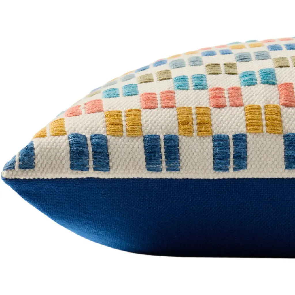 This colorful indoor/outdoor throw pillow features a geometric design with raised embroidered details, a playful accent in living rooms and on patios and porches. The 22” x 22” square pillow is hand-loomed in India of soft yet durable polyester.