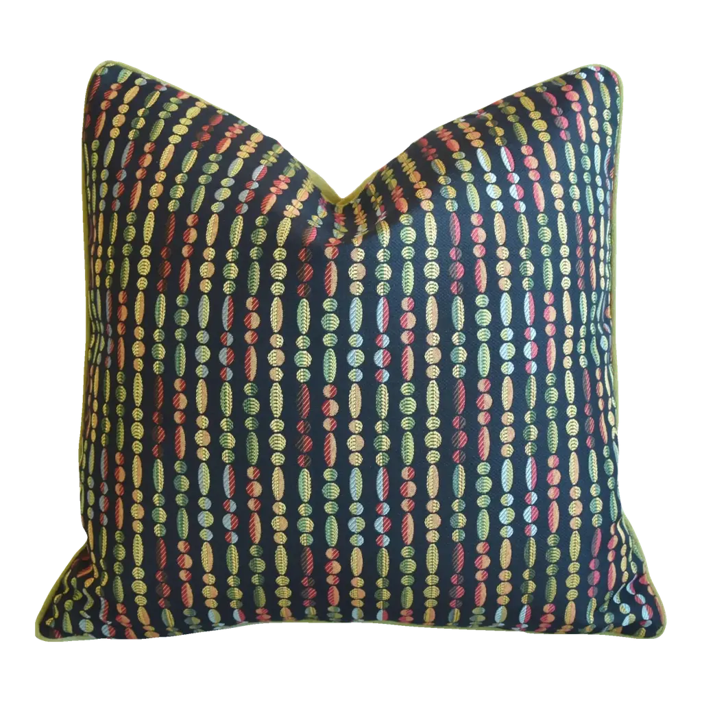Add our Amerson accent pillow to your sofa or chair for an effortless pop of color and texture. Featuring a multi-colored trellis stripe with rayon chenille embroidery for a high-low effect, this accent pillow has a feather-down blend interior and is available in four colors. Select your color before adding to cart.