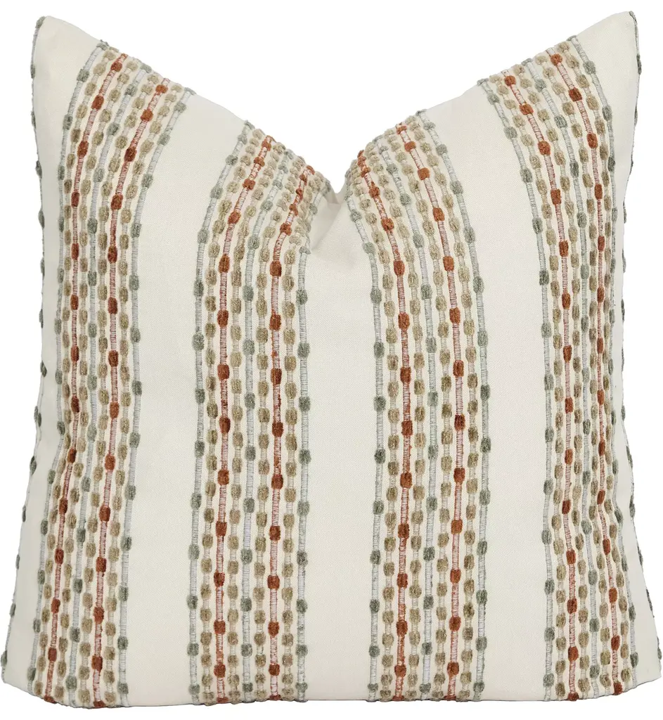 Add our Amerson accent pillow to your sofa or chair for an effortless pop of color and texture. Featuring a multi-colored trellis stripe with rayon chenille embroidery for a high-low effect, this accent pillow has a feather-down blend interior and is available in four colors. Select your color before adding to cart.
