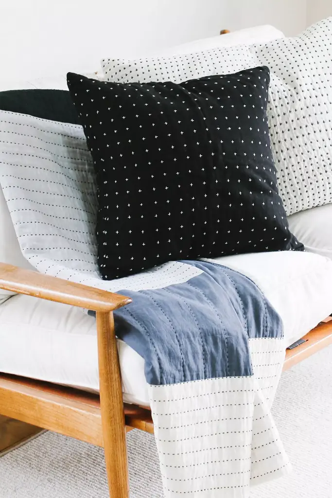 Ethically made using cotton canvas, this pillow features a hand-stitched cross-stitch design perfect for mixing and matching into any pillow arrangement.Anchal [on-chal] is an award-winning, social enterprise that uses design thinking to create innovative products and sustainable employment for exploited women worldwide. The contemporary geometric designs are defined by sophisticated patchwork and aggregated stitch patterns, revolutionizing traditional quilting techniques. Anchal's home goods and fashion accessories are hand-stitched by 130 artisans in Ajmer, India with layers of the softest cotton since 2010. Every purchase of an Anchal product has an immediate impact and provides an artisan with a full-time job, health care benefits, design training, and educational workshops.* Bottom zip closure* Embroidered front, solid back* Removable feather/down insert included* 100% cotton* Dry clean recommended* Imported#### *Dimensions** 22"L, 22"W