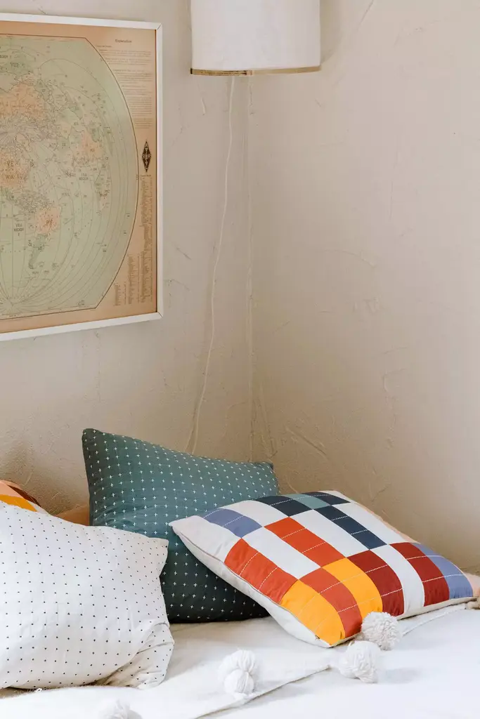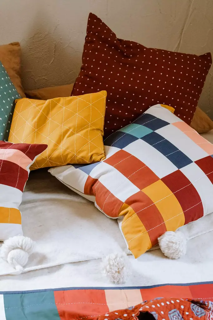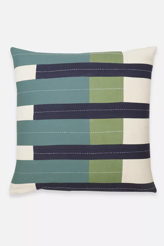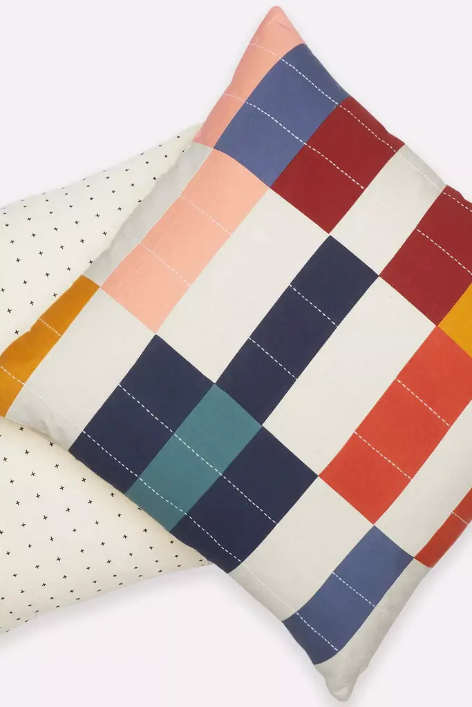This checkered throw pillow features a vibrant, colorful patchwork pattern ideal for mixing and matching, while additional hand-embroidered Kantha stitching lends dimension for an artisanal look. Whether on a sofa or bed, this pillow is sure to liven up any space.Anchal [on-chal] is an award-winning, social enterprise that uses design thinking to create innovative products and sustainable employment for exploited women worldwide. The contemporary geometric designs are defined by sophisticated patchwork and aggregated stitch patterns, revolutionizing traditional quilting techniques. Anchal's home goods and fashion accessories are hand-stitched by 130 artisans in Ajmer, India with layers of the softest GOTS certified organic cotton since 2010. Every purchase of an Anchal product has an immediate impact and provides an artisan with a full-time job, health care benefits, design training, and educational workshops.* Bottom zip closure* Embroidered front, solid back* Removable feather/down insert included* 100% organic cotton* Dry clean recommended* Imported#### *Dimensions** 22"L, 22"W