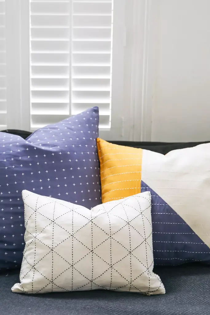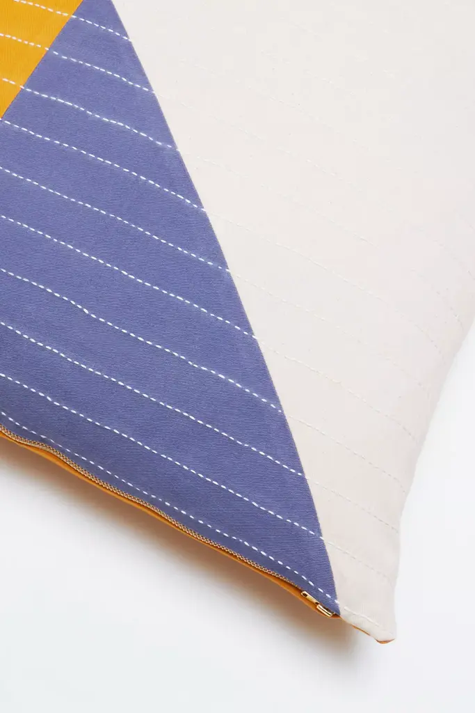 Ethically made using organic cotton canvas, this accent pillow features a geometric patchwork design complete with hand-stitching adding a modern touch to any room.Anchal [on-chal] is an award-winning, social enterprise that uses design thinking to create innovative products and sustainable employment for exploited women worldwide. The contemporary geometric designs are defined by sophisticated patchwork and aggregated stitch patterns, revolutionizing traditional quilting techniques. Anchal's home goods and fashion accessories are hand-stitched by 130 artisans in Ajmer, India with layers of the softest GOTS certified organic cotton since 2010. Every purchase of an Anchal product has an immediate impact and provides an artisan with a full-time job, health care benefits, design training, and educational workshops.* Bottom zip closure* Embroidered front, solid back* Removable feather/down insert included* 100% organic cotton* Dry clean recommended* Imported#### *Dimensions** 18"L, 18"W