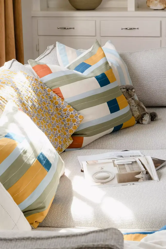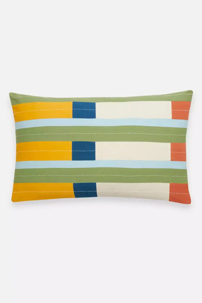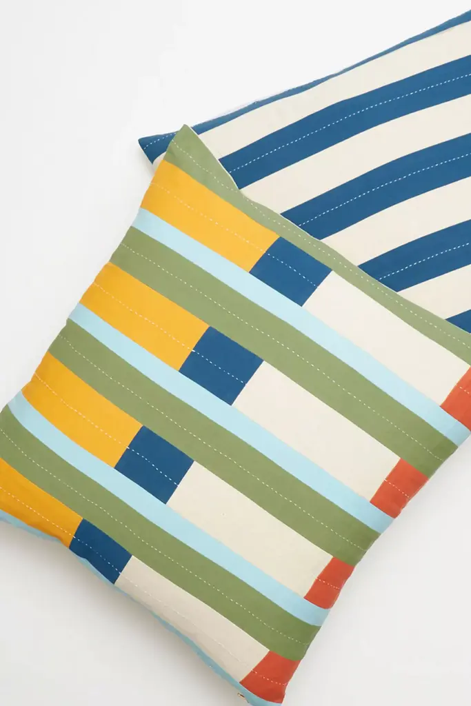 The perfect complement to the Stamp Quilt, this classic and playful pattern features vibrant stripes of green, yellow, rust, and blue. At the same time, additional hand-embroidered Kantha stitching lends dimension to an artisanal look. Whether on a sofa or bed, this pillow will stand out.Anchal [on-chal] is an award-winning, social enterprise that uses design thinking to create innovative products and sustainable employment for exploited women worldwide. The contemporary geometric designs are defined by sophisticated patchwork and aggregated stitch patterns, revolutionizing traditional quilting techniques. Anchal's home goods and fashion accessories are hand-stitched by 130 artisans in Ajmer, India with layers of the softest cotton since 2010. Every purchase of an Anchal product has an immediate impact and provides an artisan with a full-time job, health care benefits, design training, and educational workshops.* Bottom zip closure* Embroidered front, solid back* Removable feather/down insert included* 100% cotton* Dry clean recommended* Imported