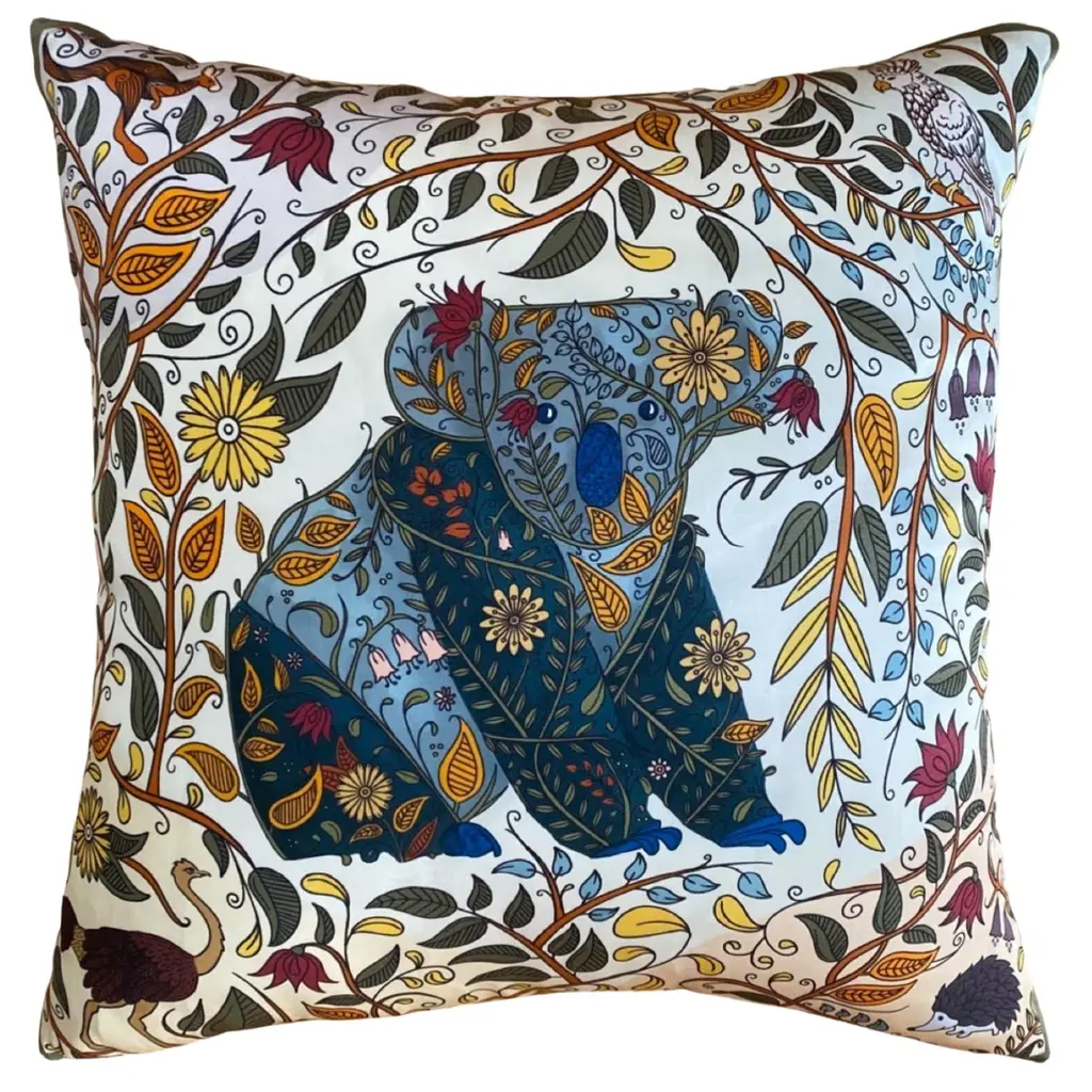 Animalia pillows is a set of cushions that tells the story of wild animals looking for love in spring time. Each Pillow features two animals of the same species set in an explosion of flowers and vegetation. On the backside of the cushion there's a green composition of vegetation.Koalas pillow.