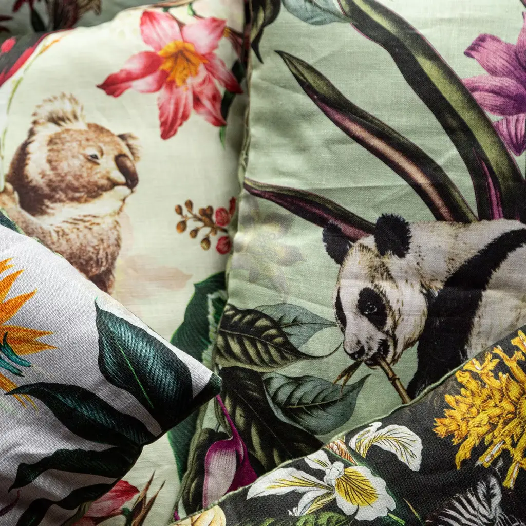 Animalia Linen Cushion With Pandas And Purple Flowers